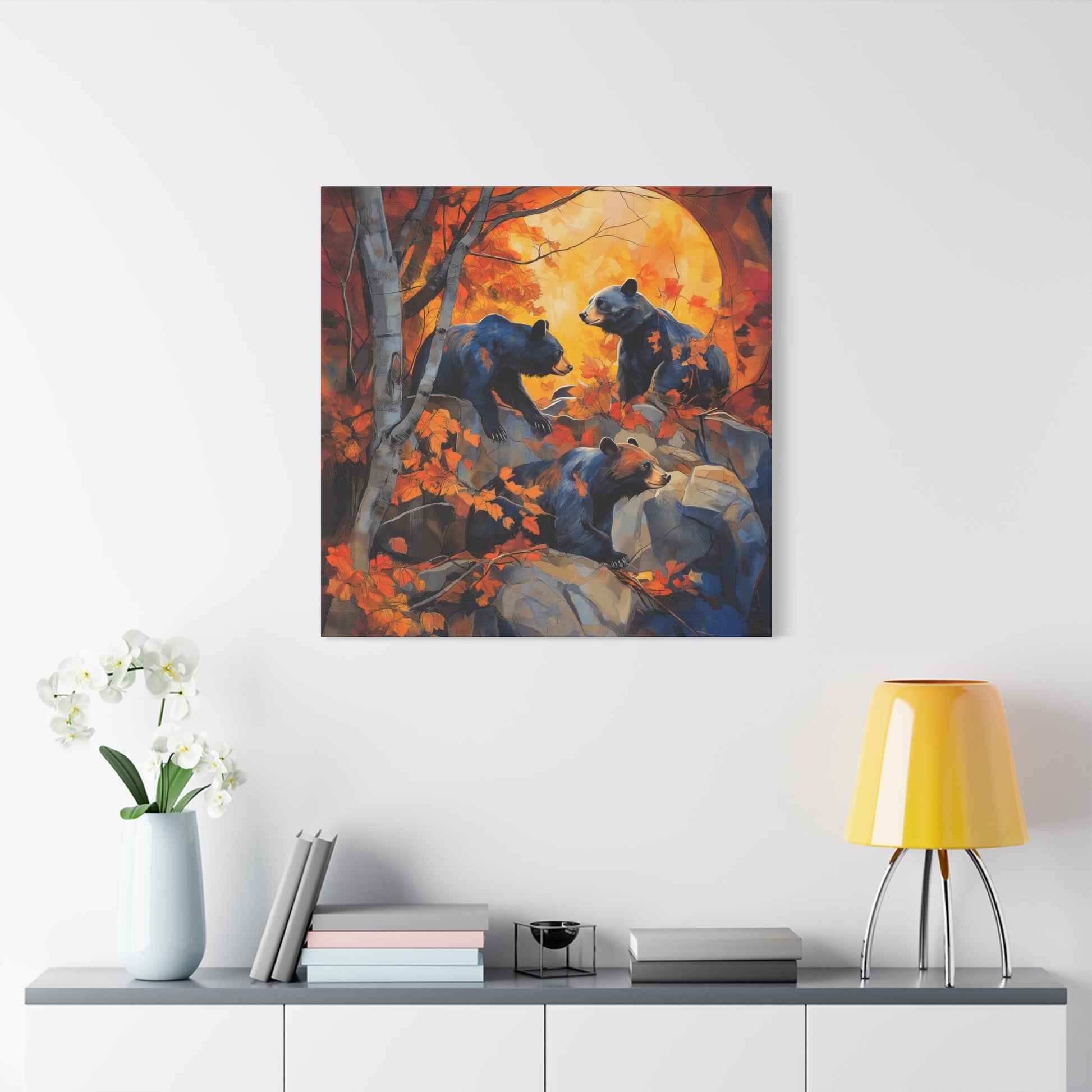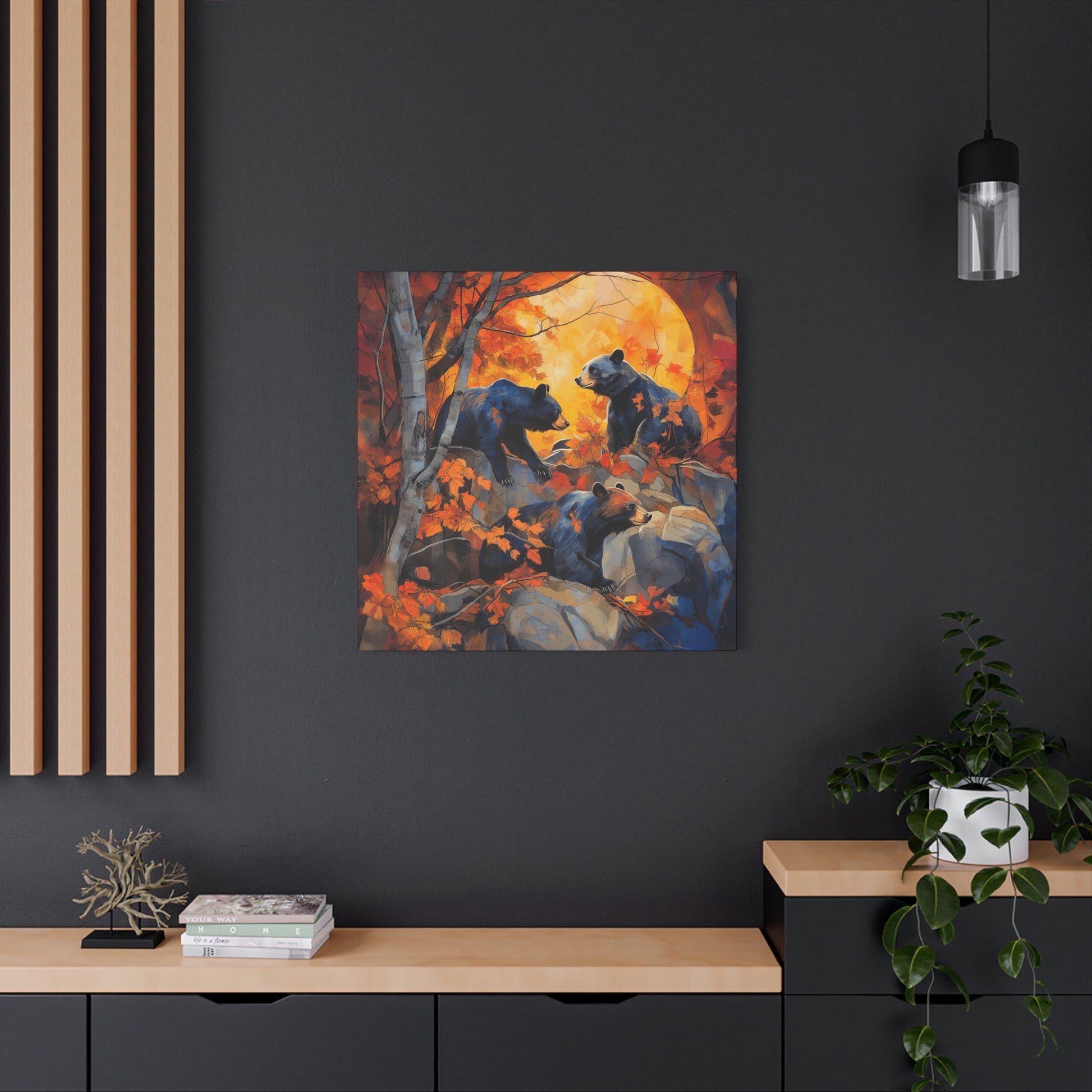 Three playful bears roam and romp across rugged rocks, bathed in the soft glow of moonlight. A charming blend of wilderness energy and serene nighttime beauty.
