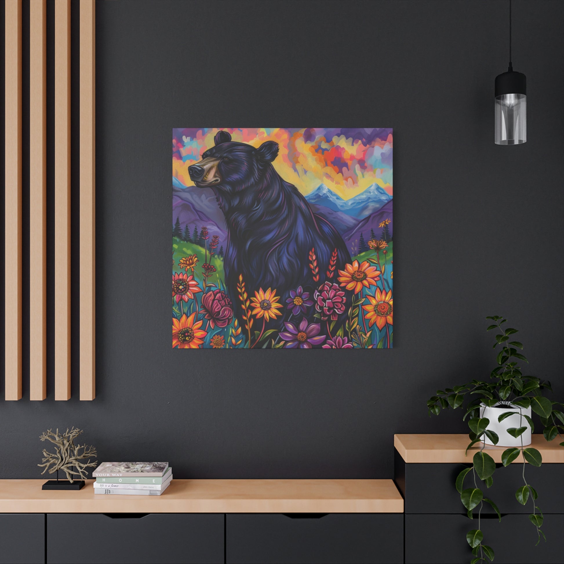 A striking scene where nature’s majesty meets vibrant color. A powerful black bear stands against a backdrop of rolling purple mountains, their hues softened by the glow of sunlight. At its feet, a meadow bursts into life with bright, wild blooms—pinks, yellows, and blues dancing together in the breeze. The composition blends strength and serenity, inviting the viewer into a moment of wilderness beauty.