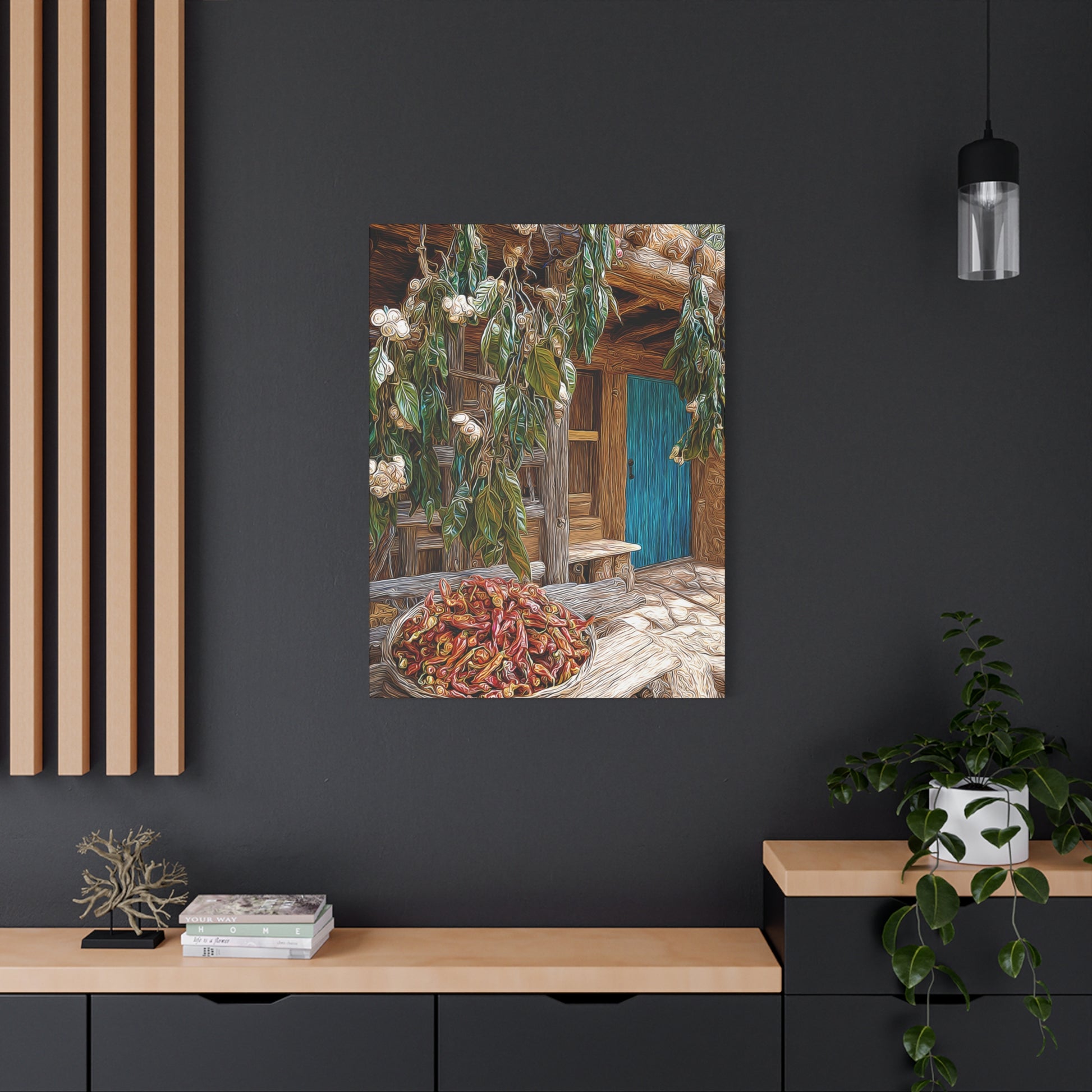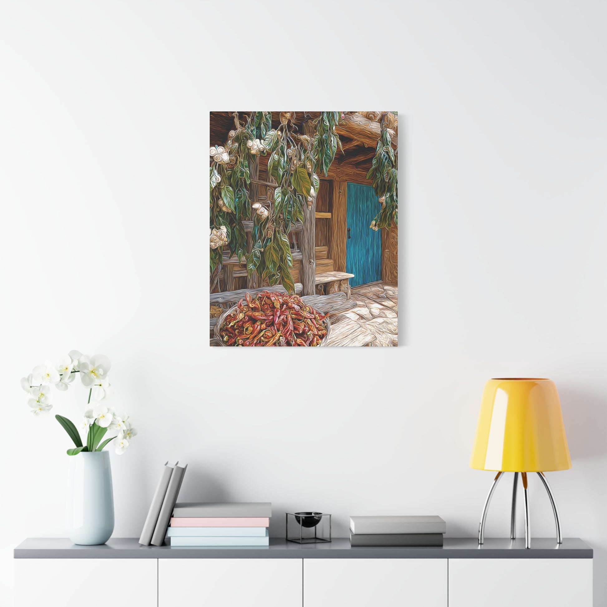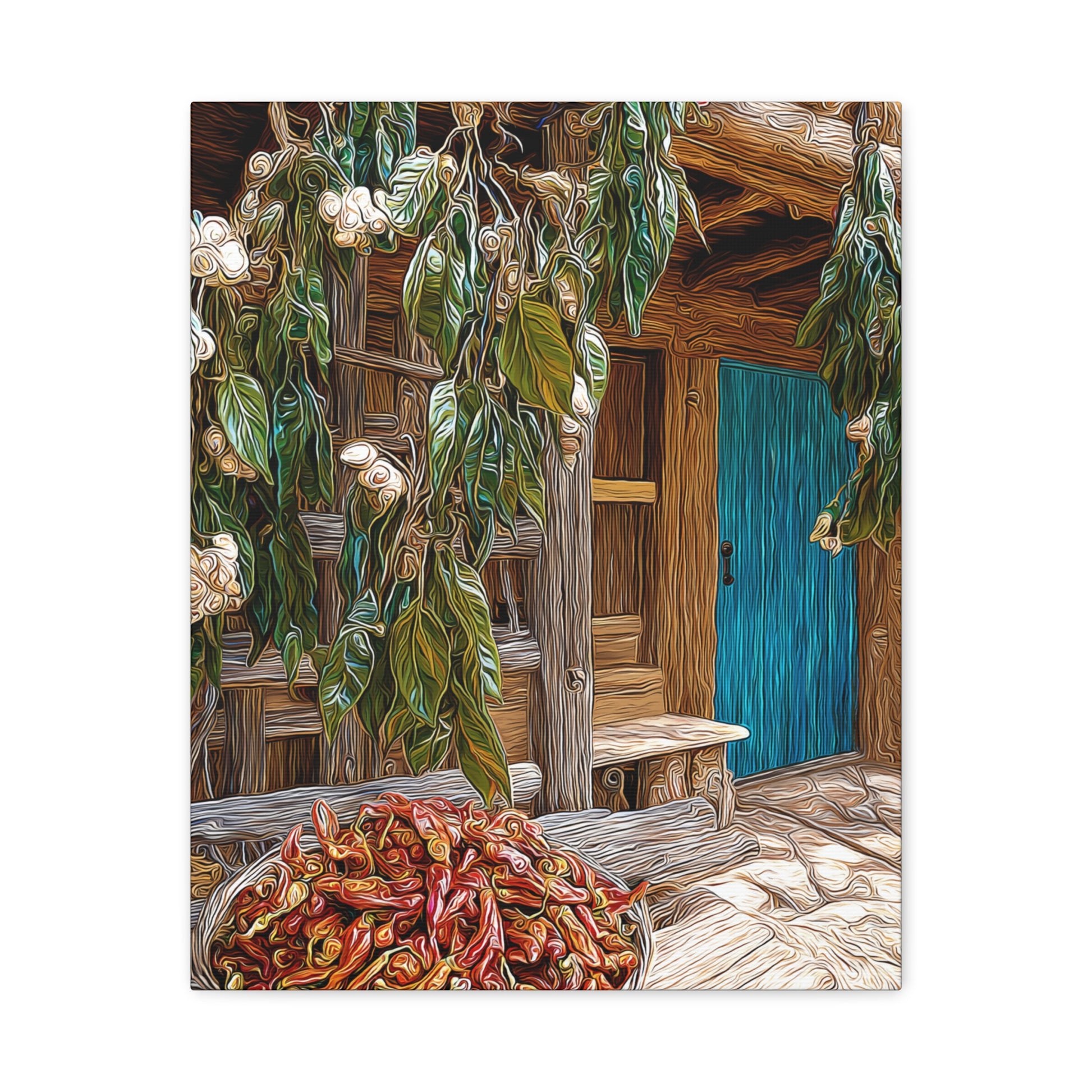 Rustic and inviting, this piece celebrates the heart of New Mexico’s world-famous chili country. Lush fields stretch toward the horizon, bursting with rows of vibrant green and deep red Hatch chilis. The warmth of the landscape blends with the quiet charm of a country homestead, evoking the rich flavors, traditions, and pride of the Southwest.