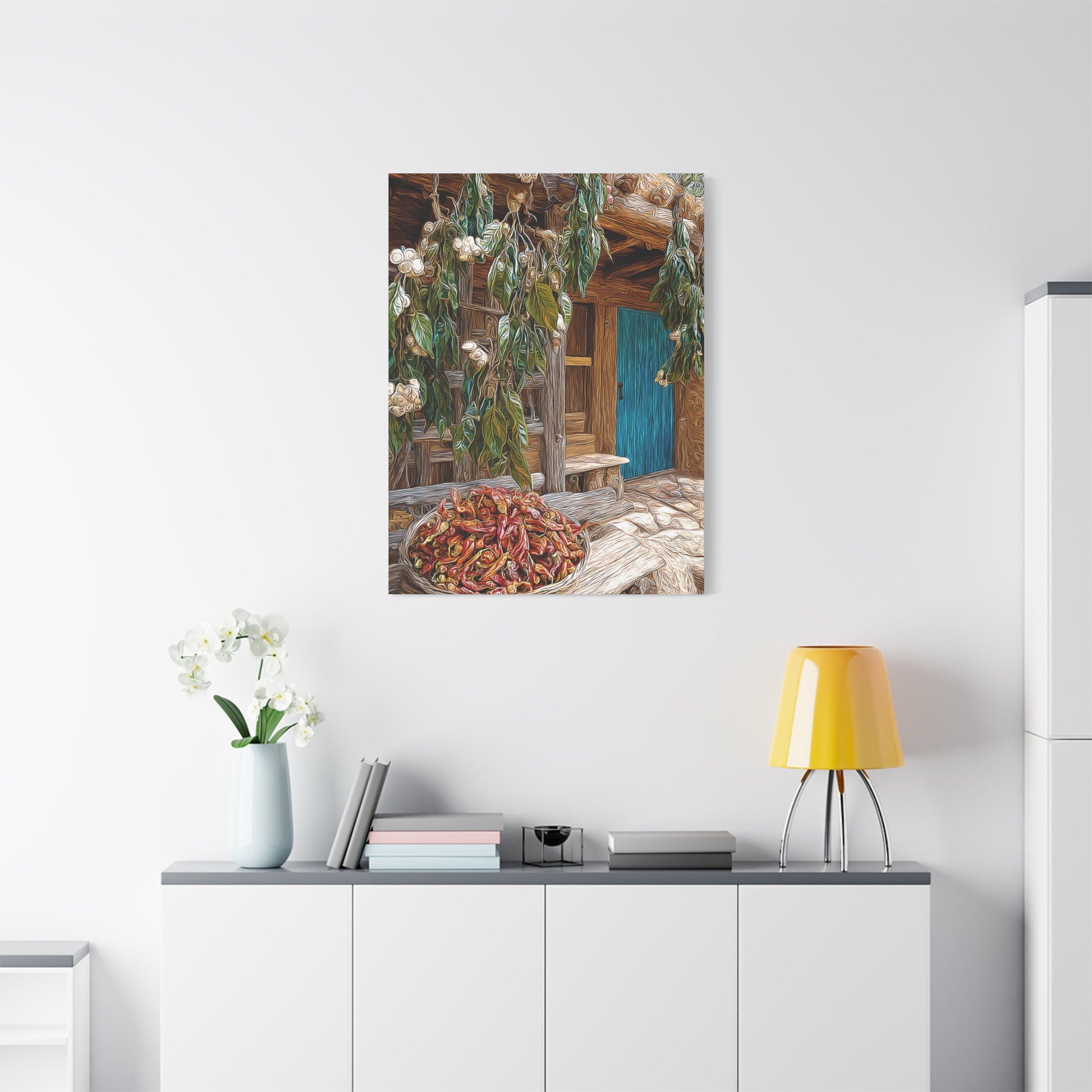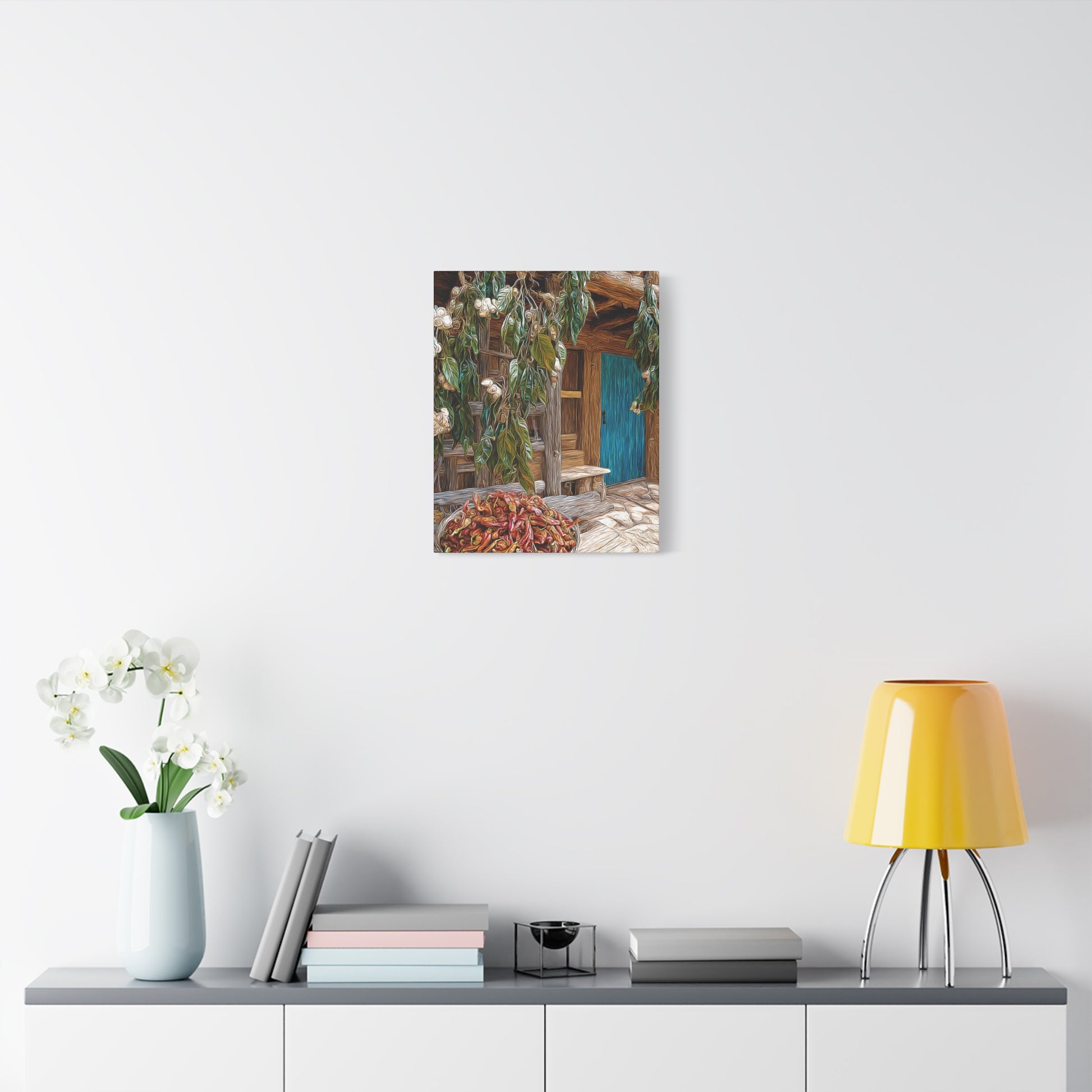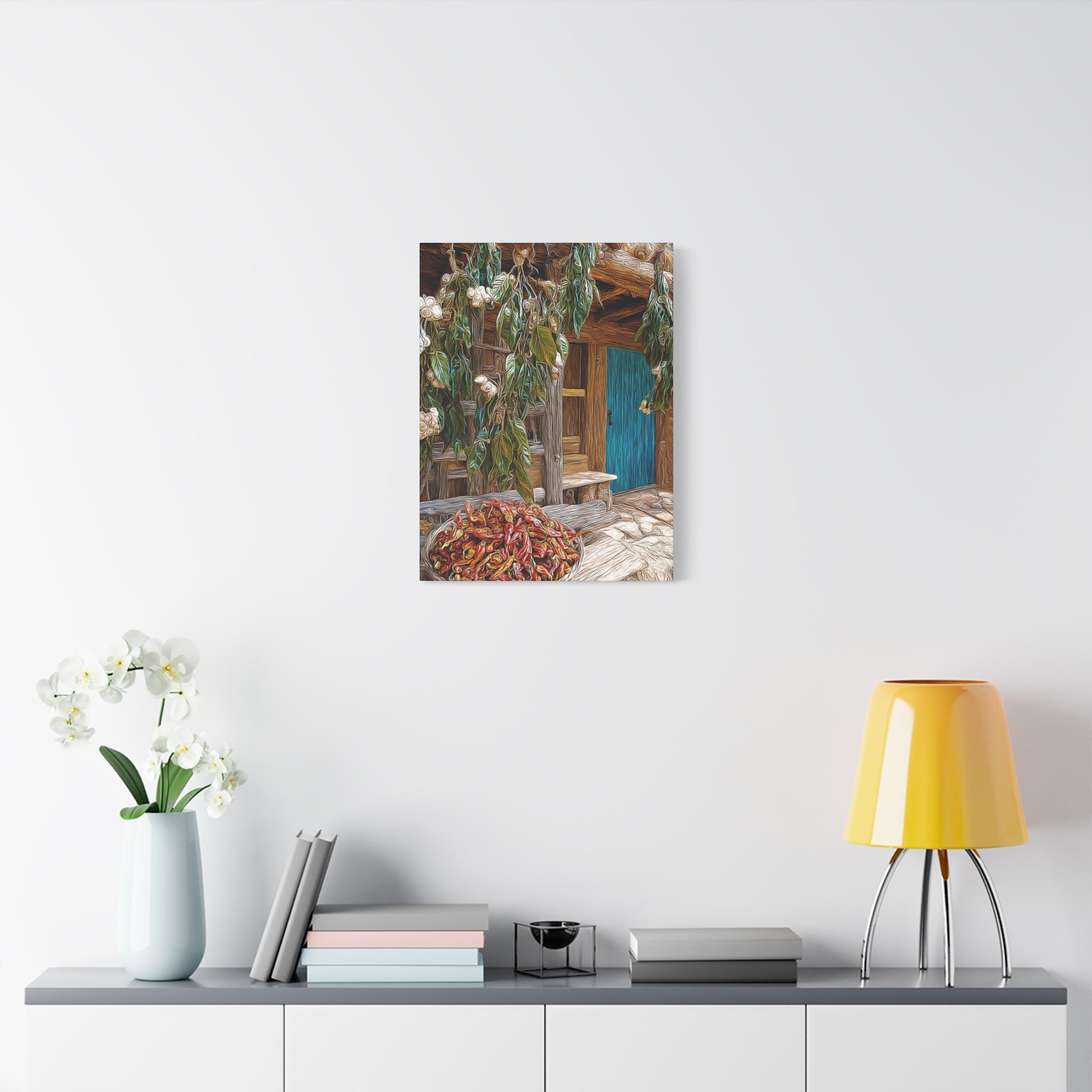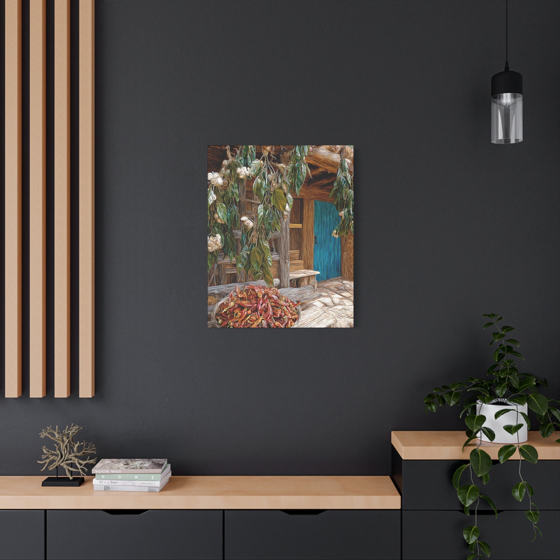 Rustic and inviting, this piece celebrates the heart of New Mexico’s world-famous chili country. Lush fields stretch toward the horizon, bursting with rows of vibrant green and deep red Hatch chilis. The warmth of the landscape blends with the quiet charm of a country homestead, evoking the rich flavors, traditions, and pride of the Southwest.
