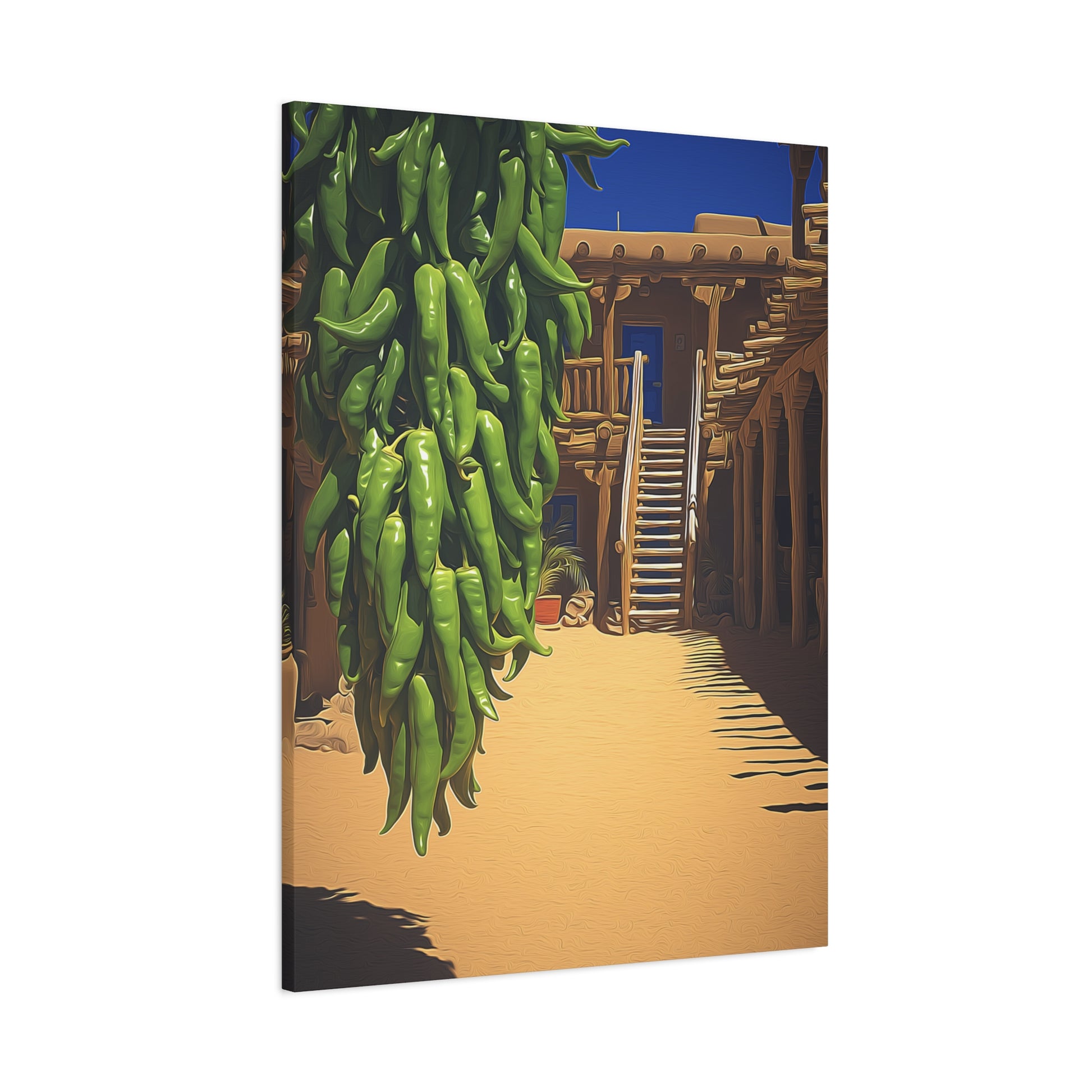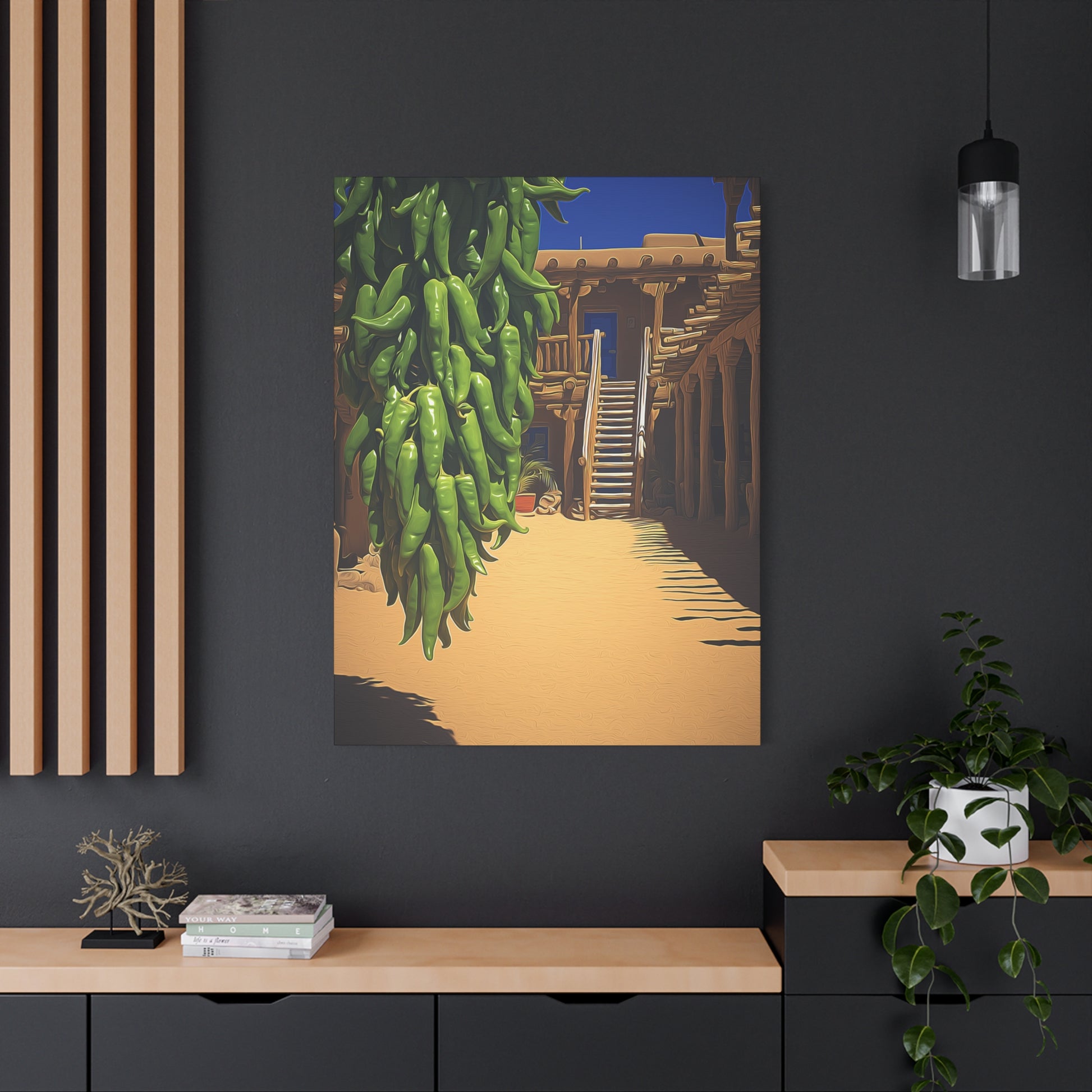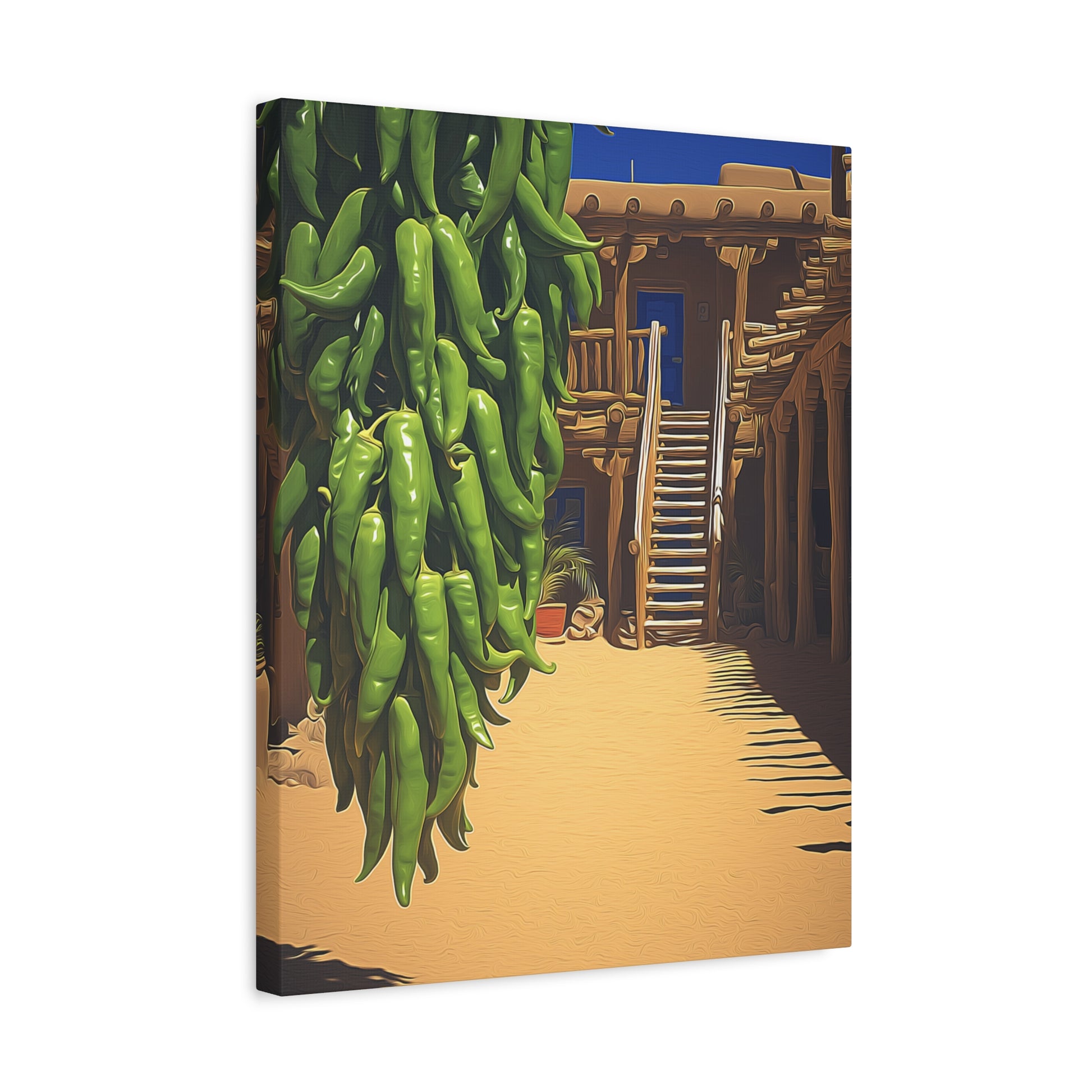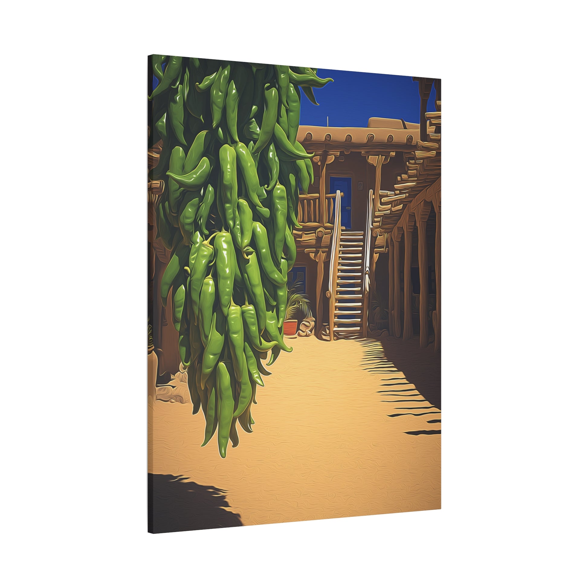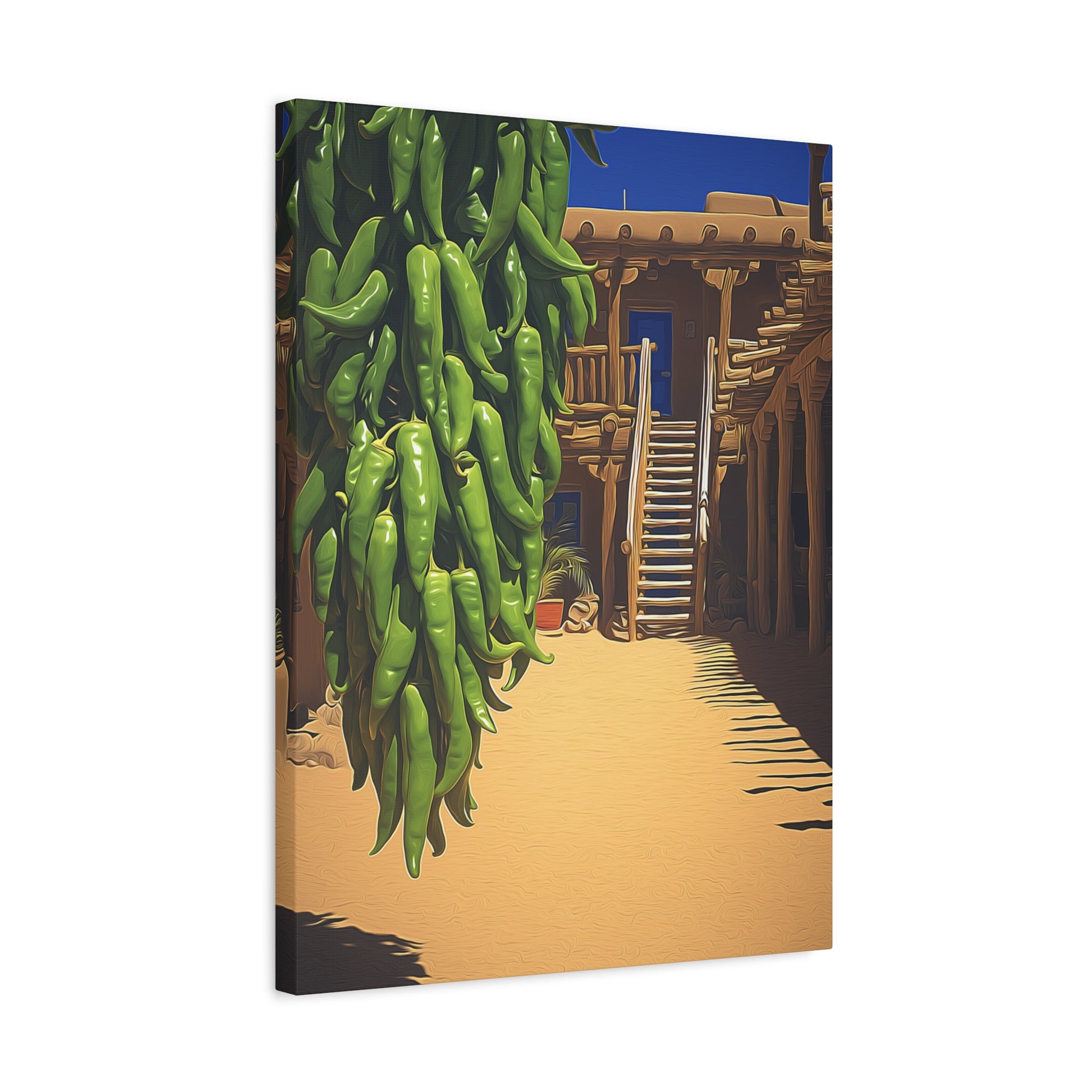Hatch Green Chile Casa – Famous Hatch green chile hanging to dry in the yard of a colorful adobe casa in Hatch, New Mexico, celebrating the region’s rich flavor and tradition.