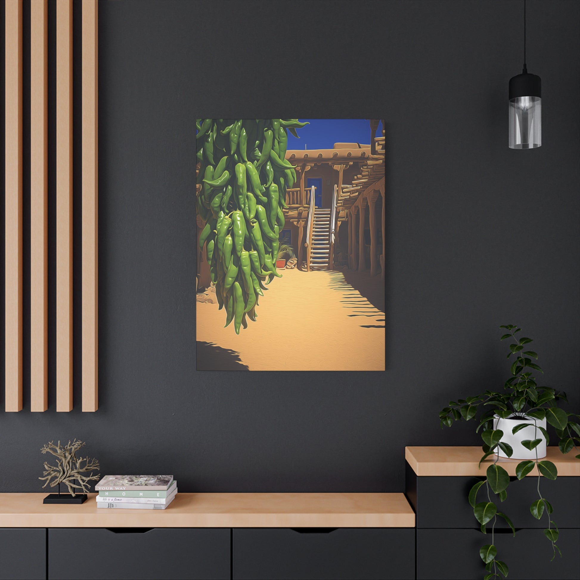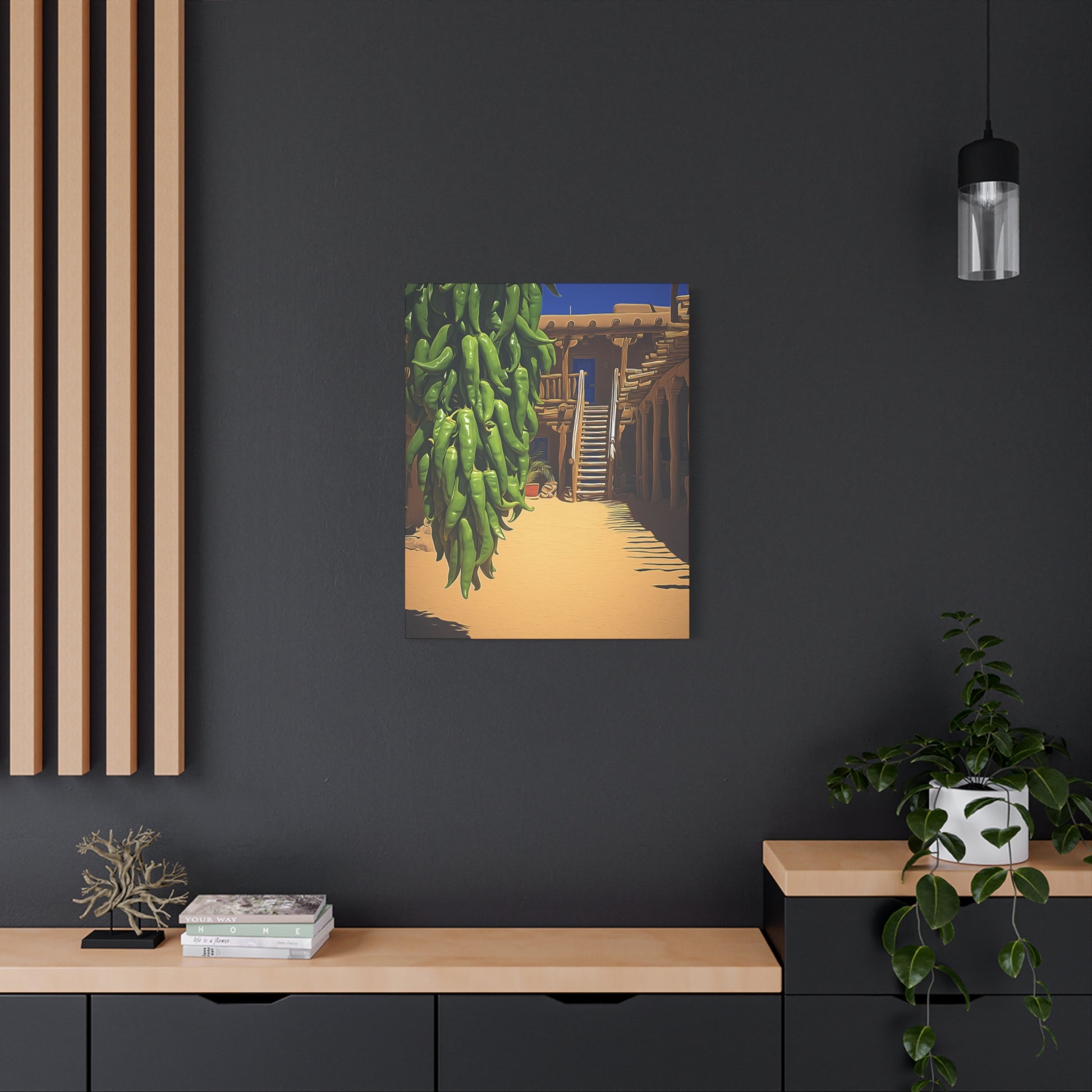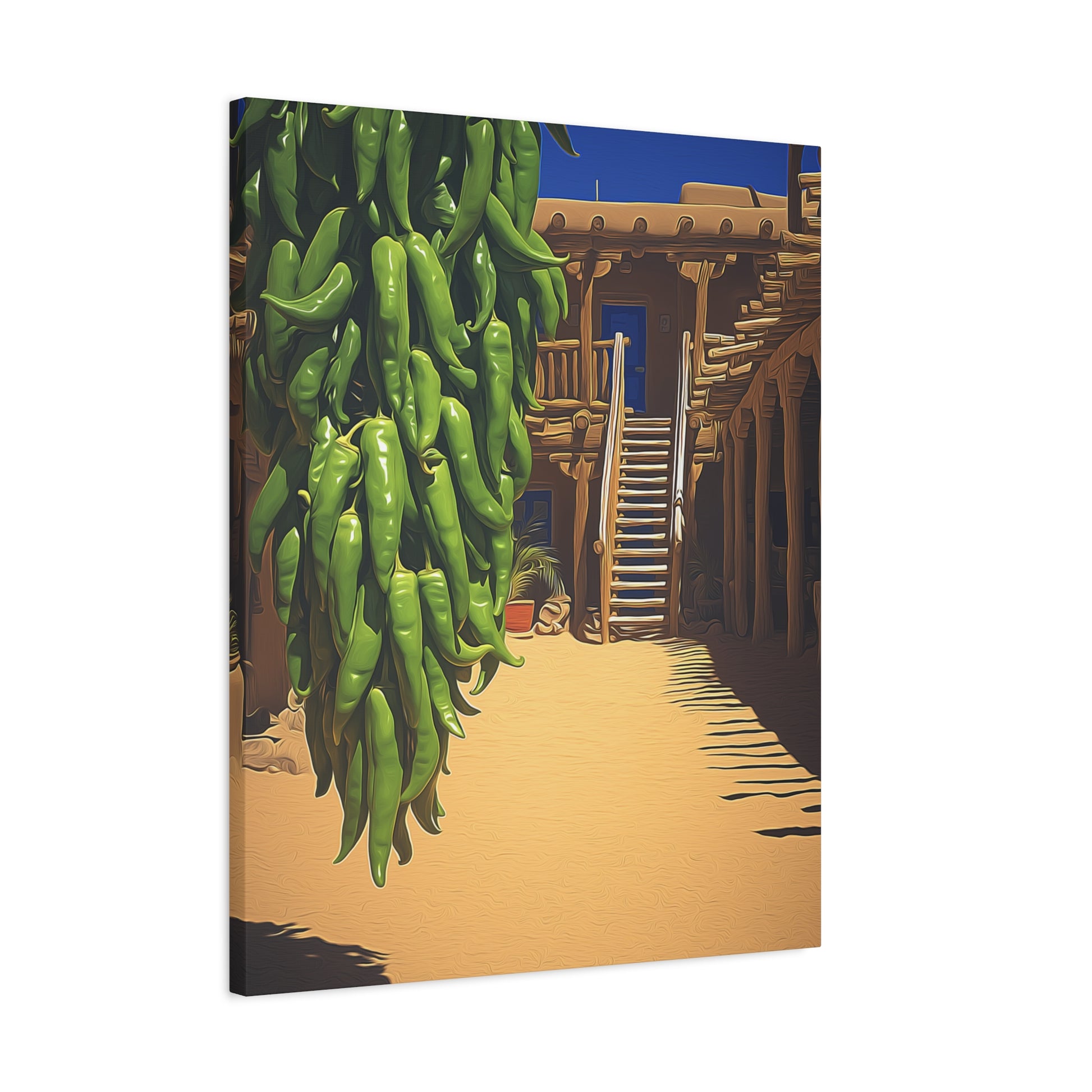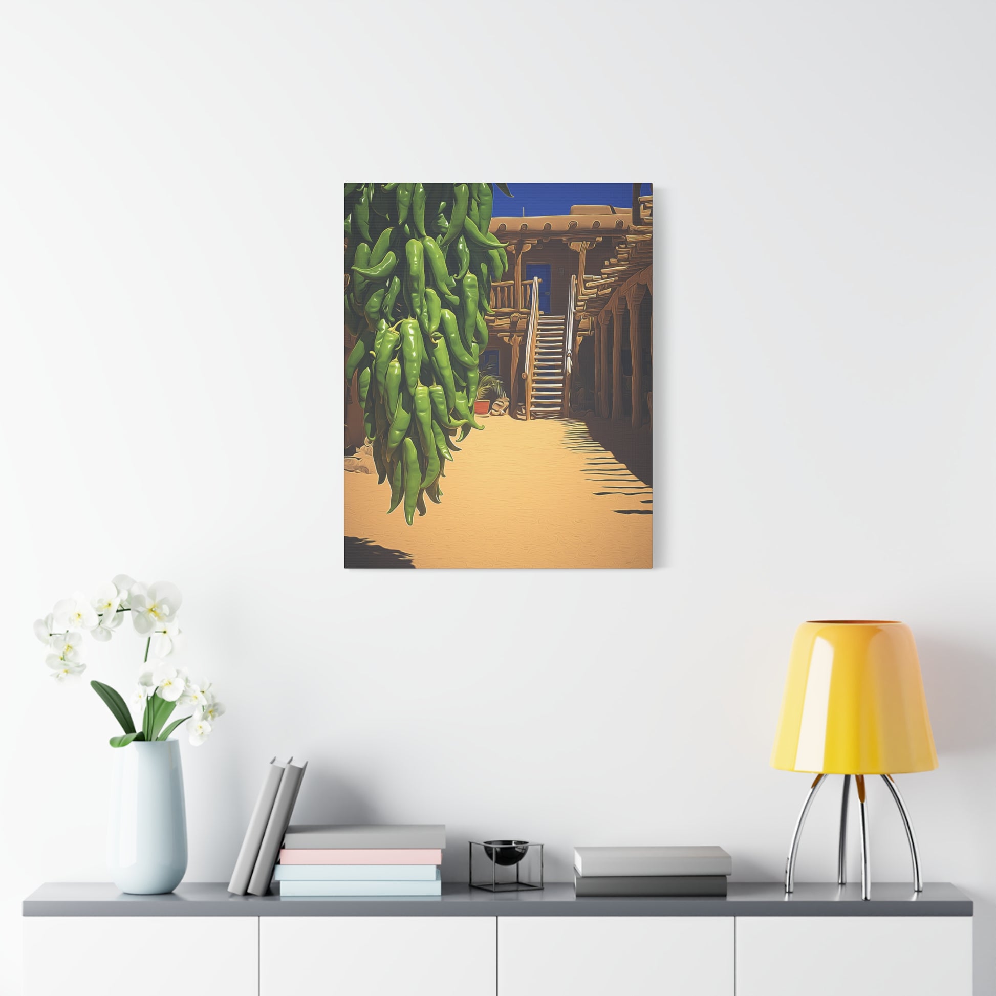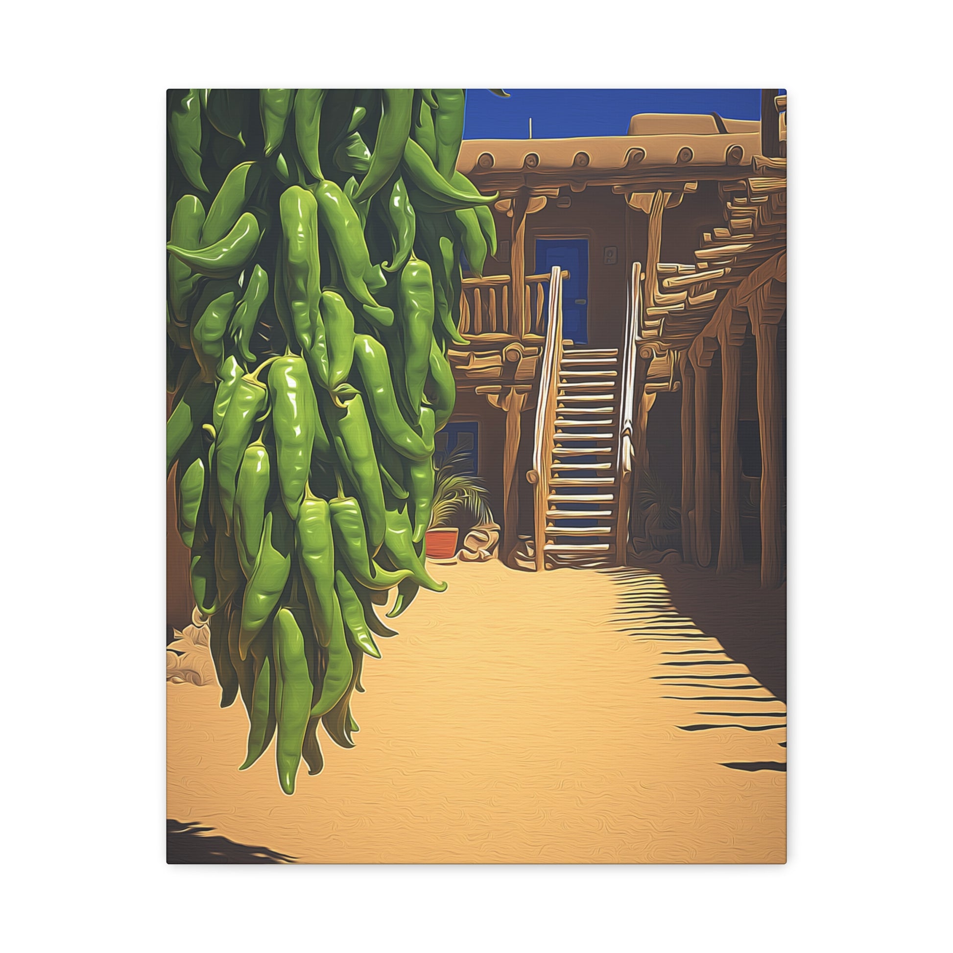 Hatch Green Chile Casa – Famous Hatch green chile hanging to dry in the yard of a colorful adobe casa in Hatch, New Mexico, celebrating the region’s rich flavor and tradition.