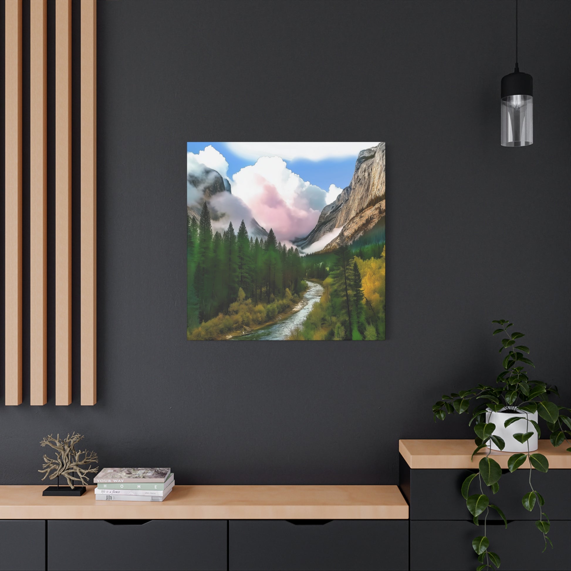 Billowing, colorful clouds drift above towering evergreen trees, framing an impressive mountain stream that winds past stunning rock walls. A vivid celebration of the Colorado Rockies’ natural drama and beauty.