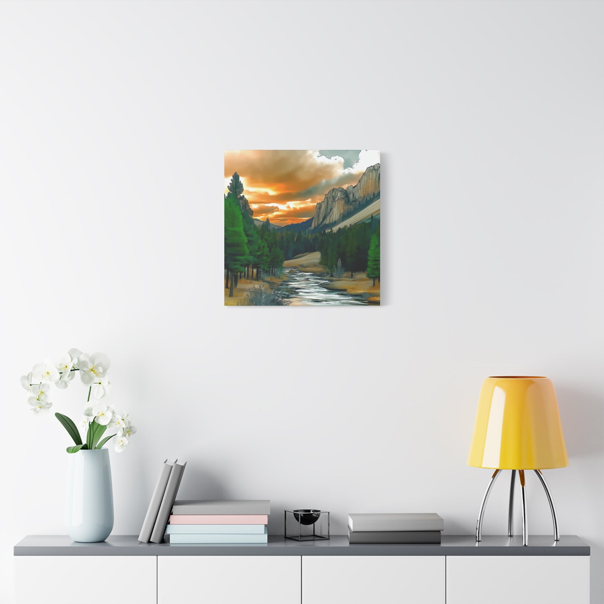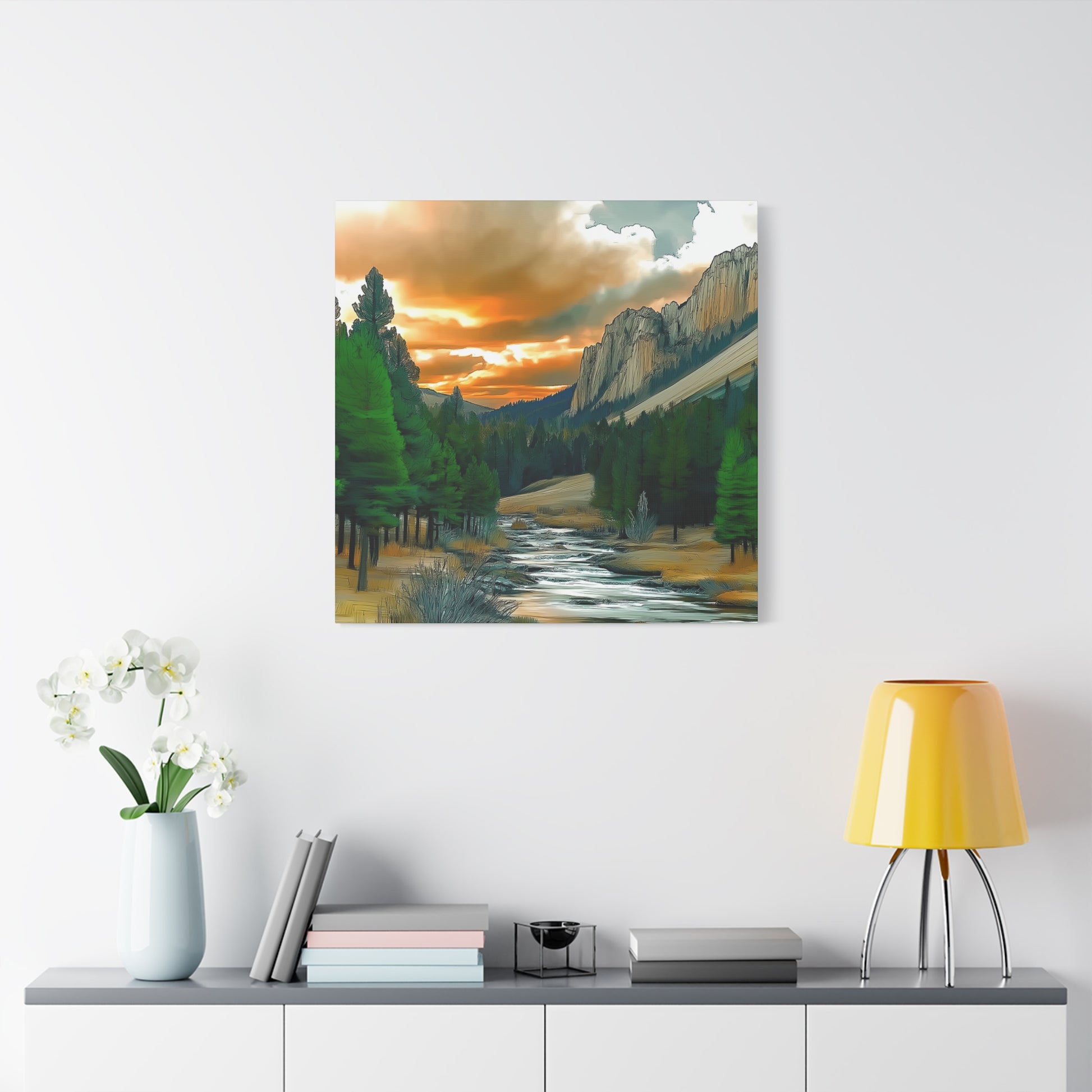 A breathtaking sunset washes the Colorado Rockies in brilliant gold, its light igniting the peaks and casting a warm glow over the landscape. Towering evergreens stand proudly in the foreground, their deep green contrasting against the radiant sky. This scene captures the grandeur and harmony of nature at its most glorious.