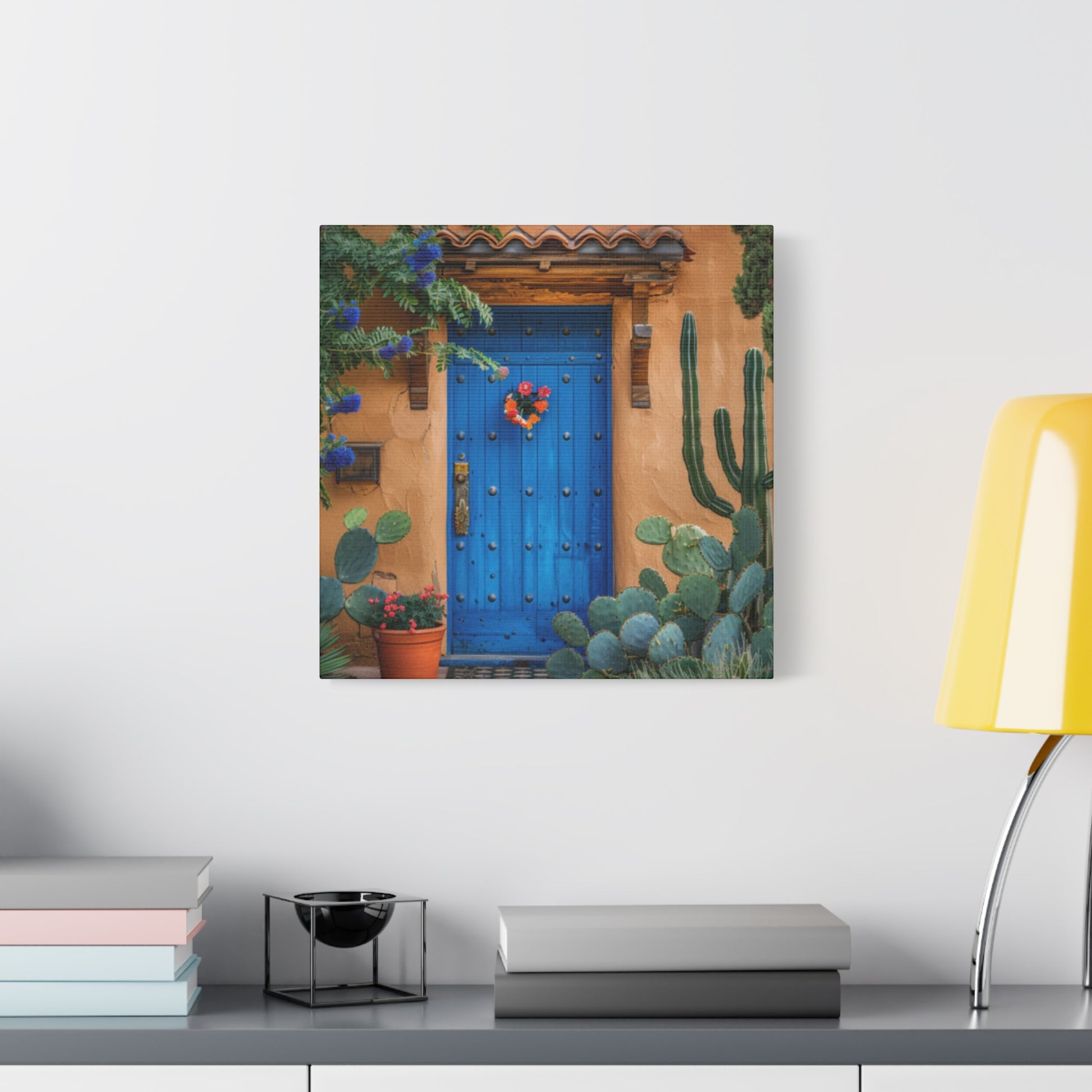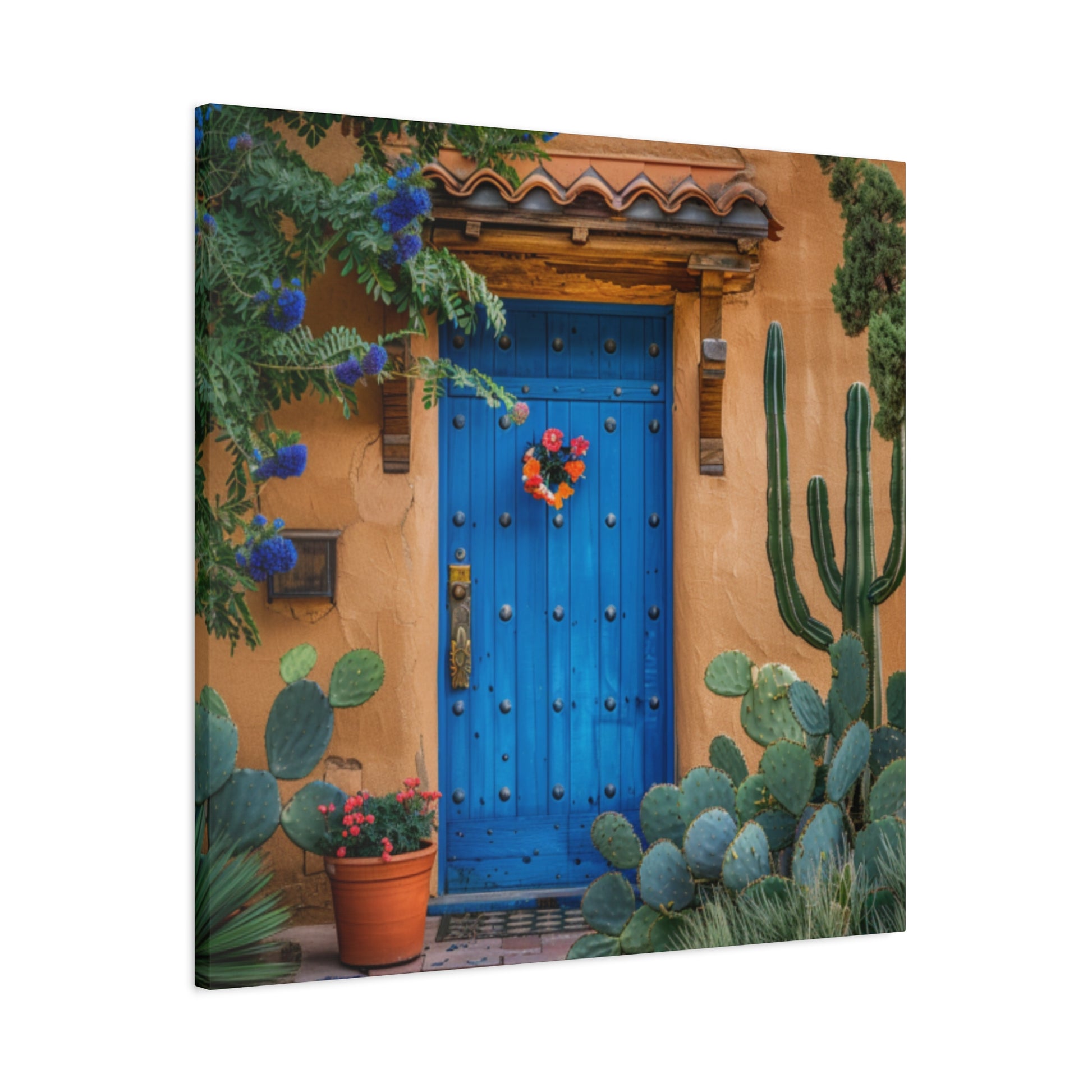 A vibrant blue door stands out against the warm tones of an adobe home, surrounded by flourishing cacti. A welcoming scene that blends Santa Fe charm with the bold colors of the Southwest.