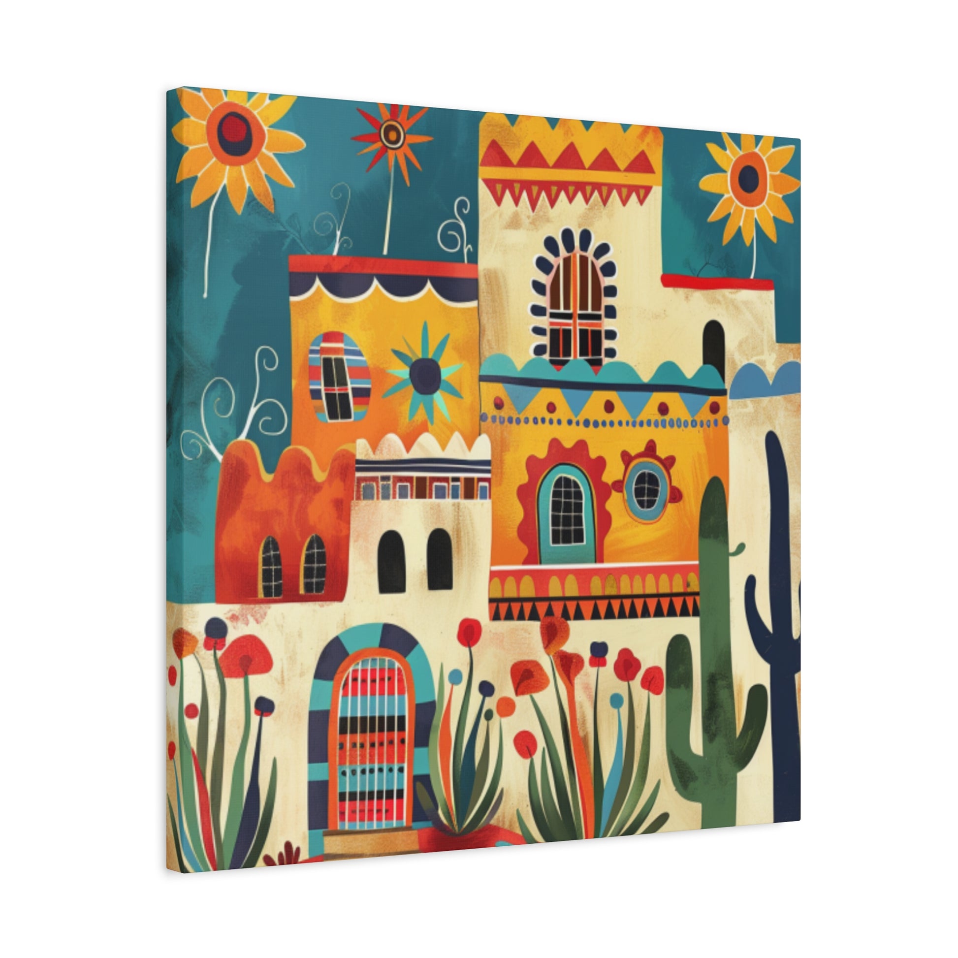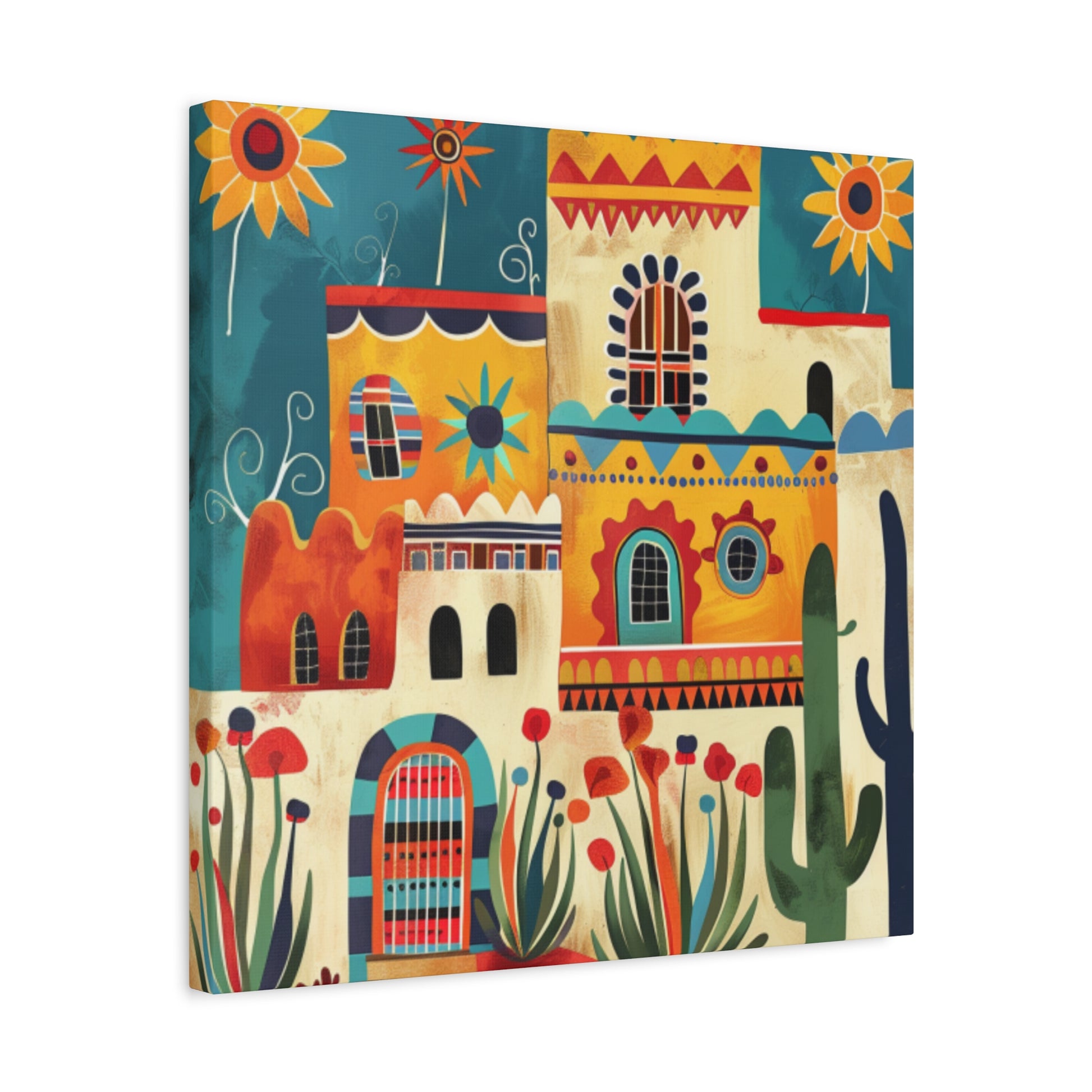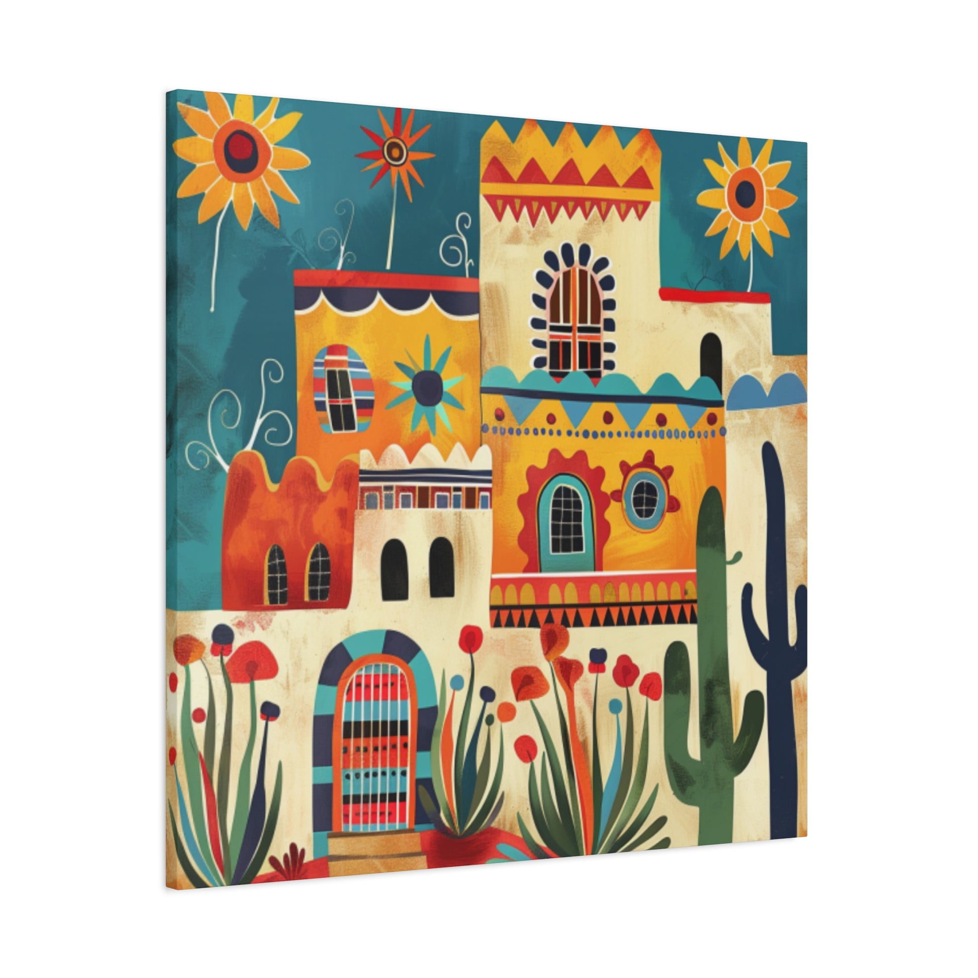 SF Pueblo – Abstract, impressionist interpretation of a Santa Fe pueblo, brought to life with bold forms and vibrant, colorful designs that capture the city’s artistic soul.
