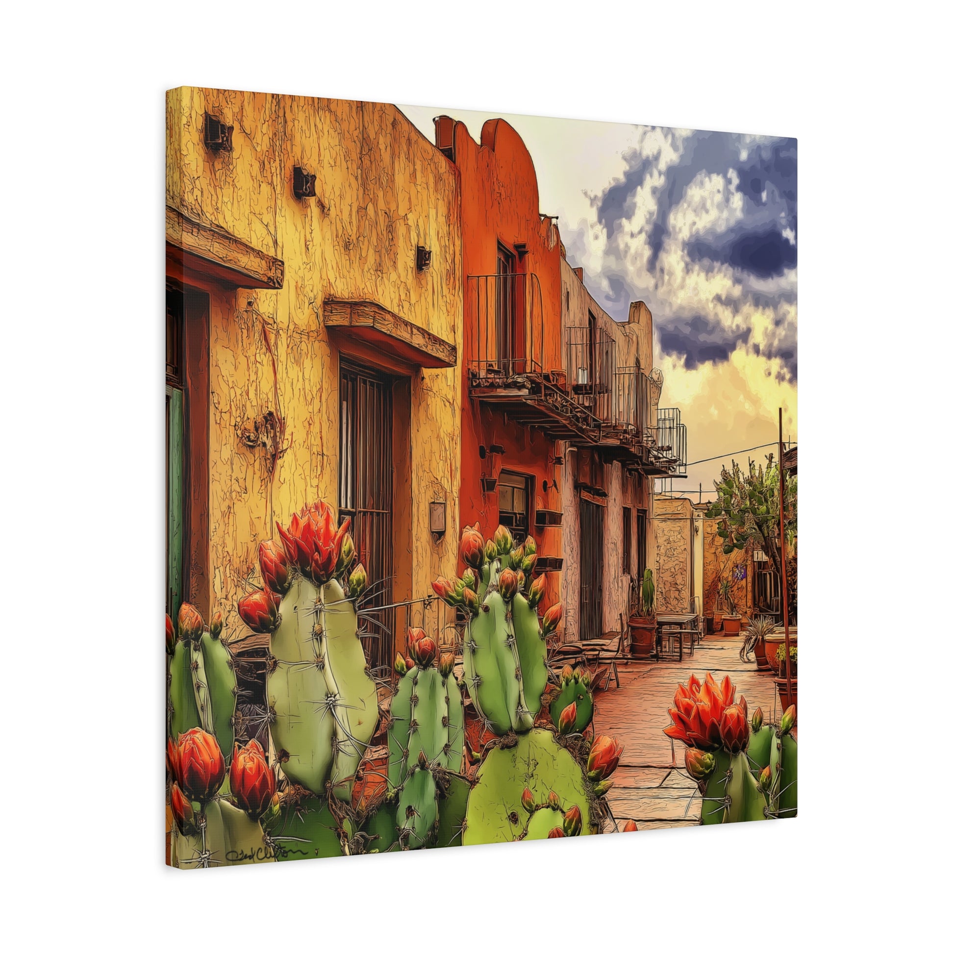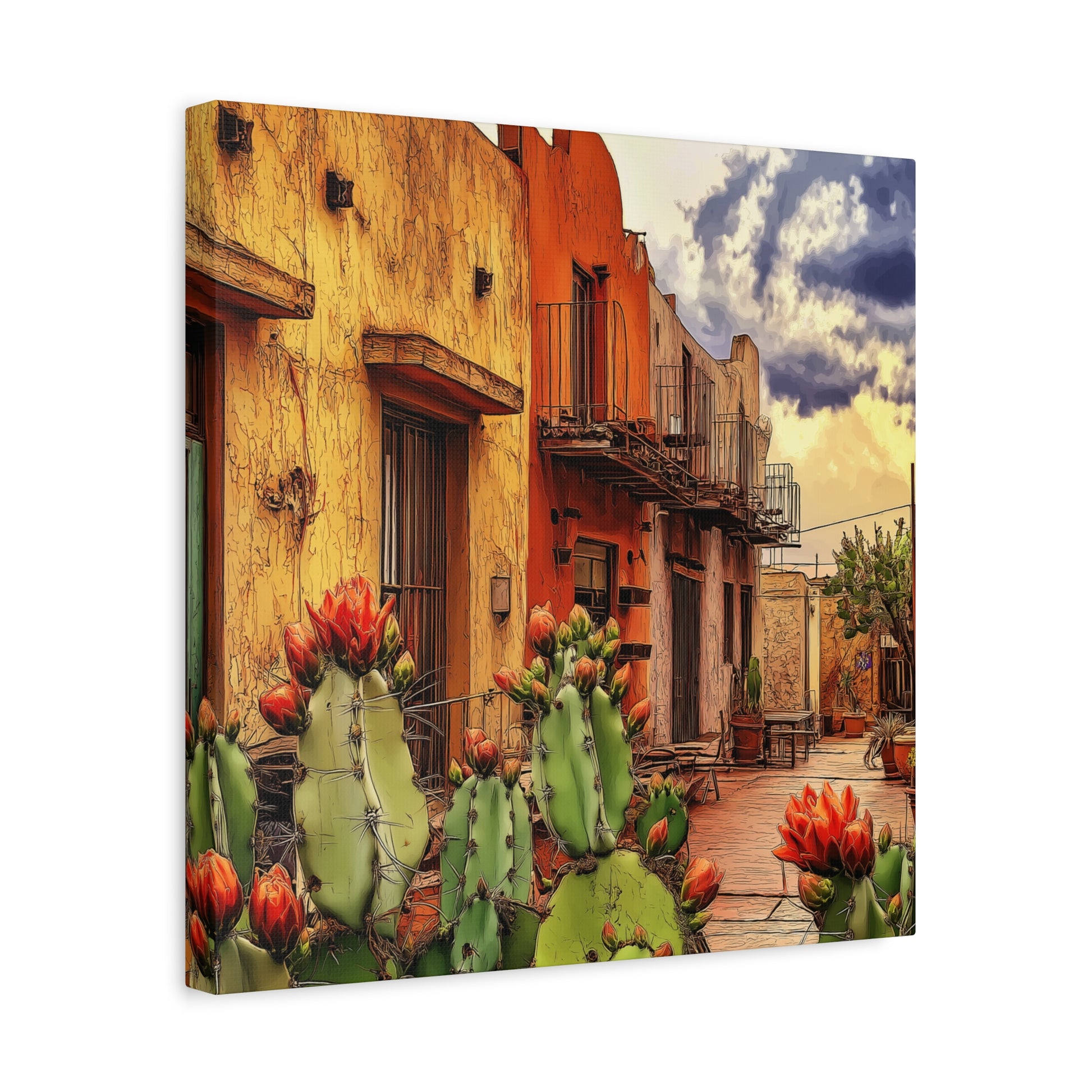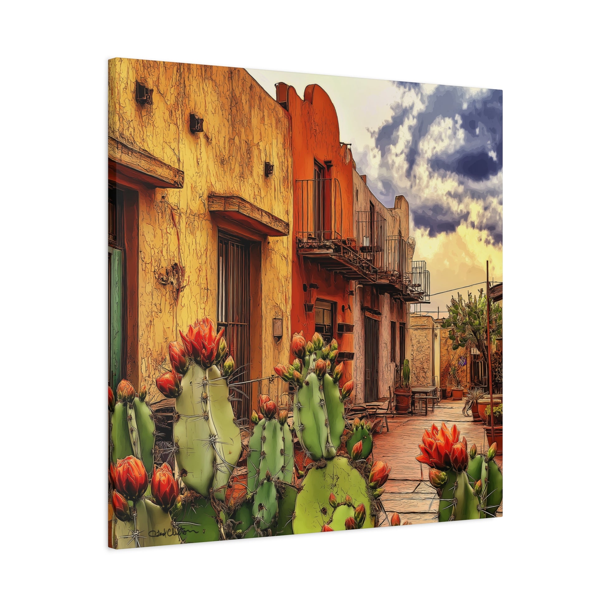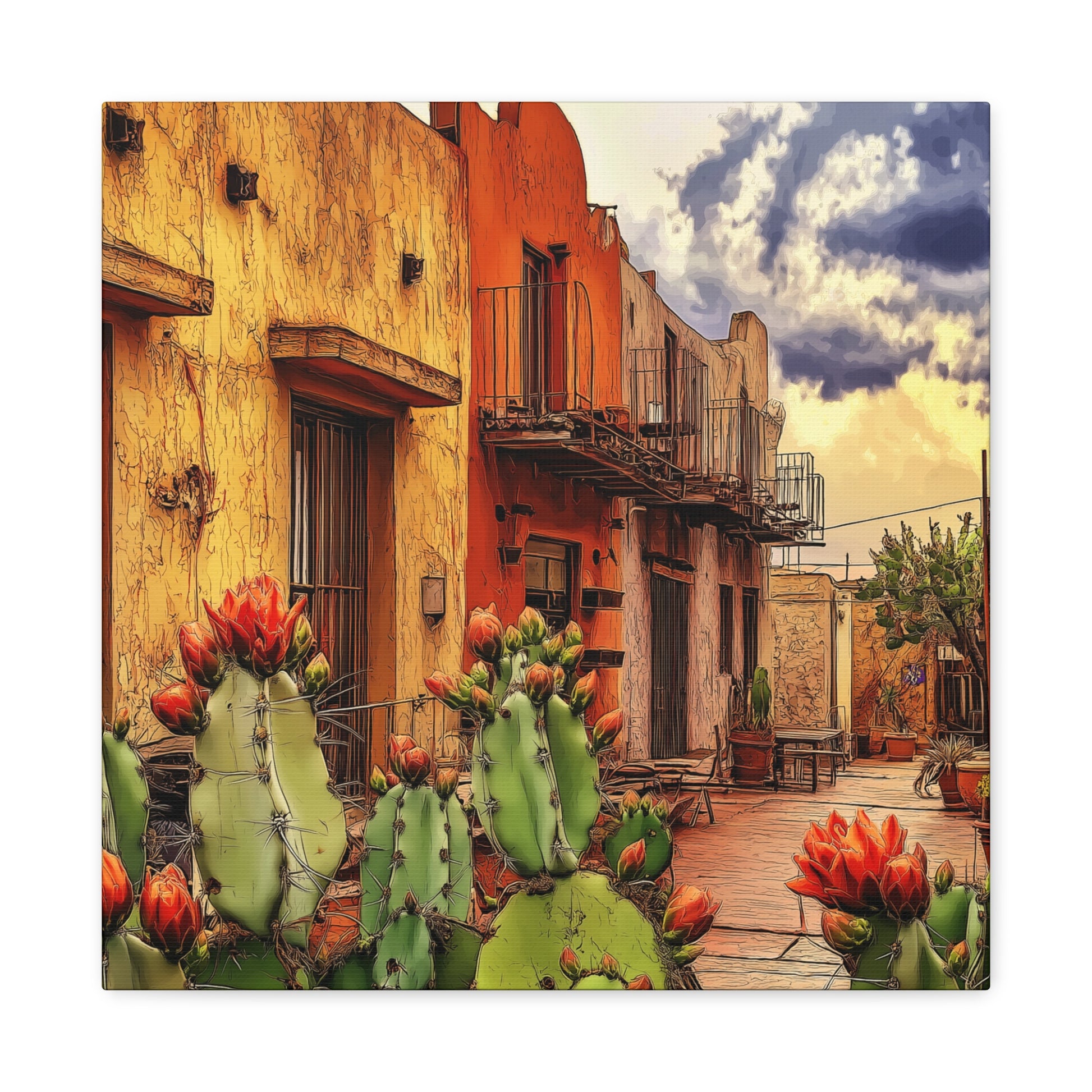 SW Village – Vibrant Southwest colors and imagery bring this scene to life. An adobe building framed by blooming cacti evokes the warmth, charm, and intrigue of an older small-town village, rich with history and character.