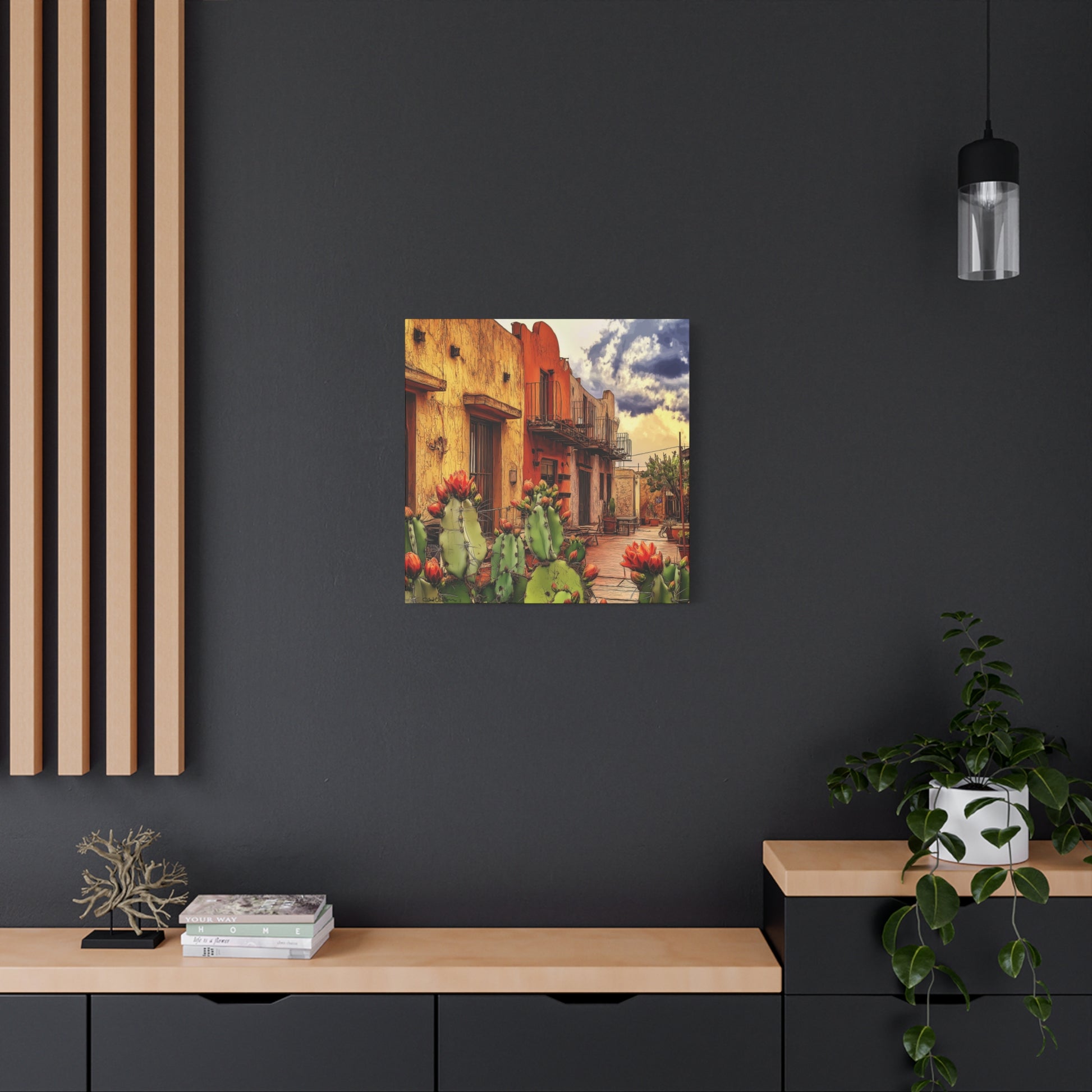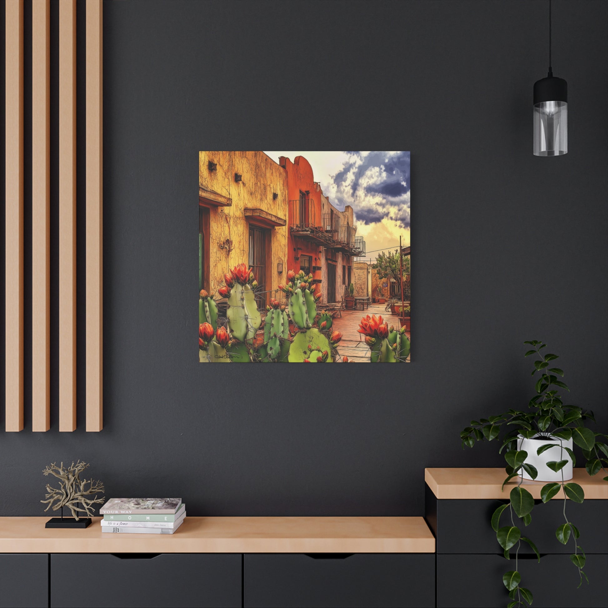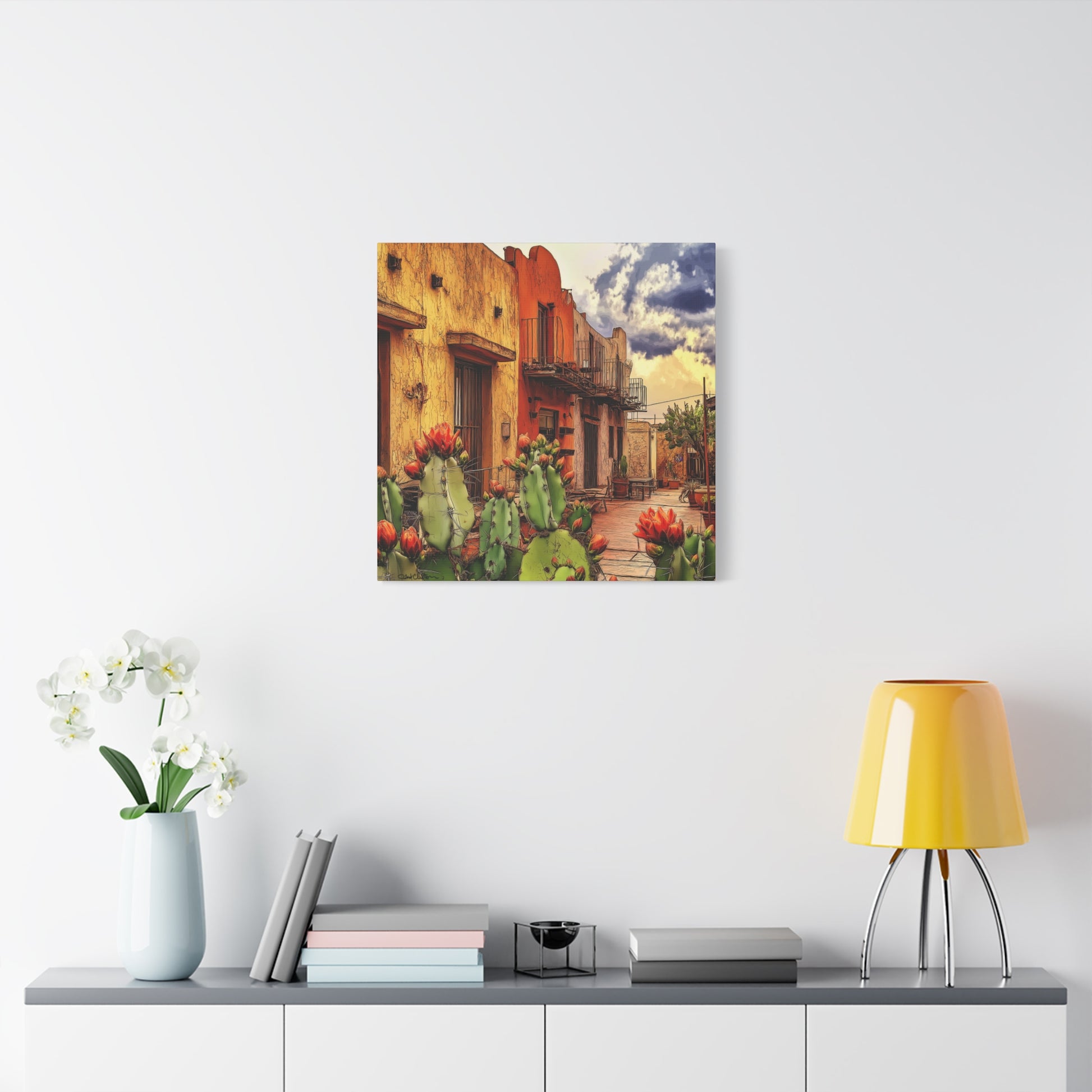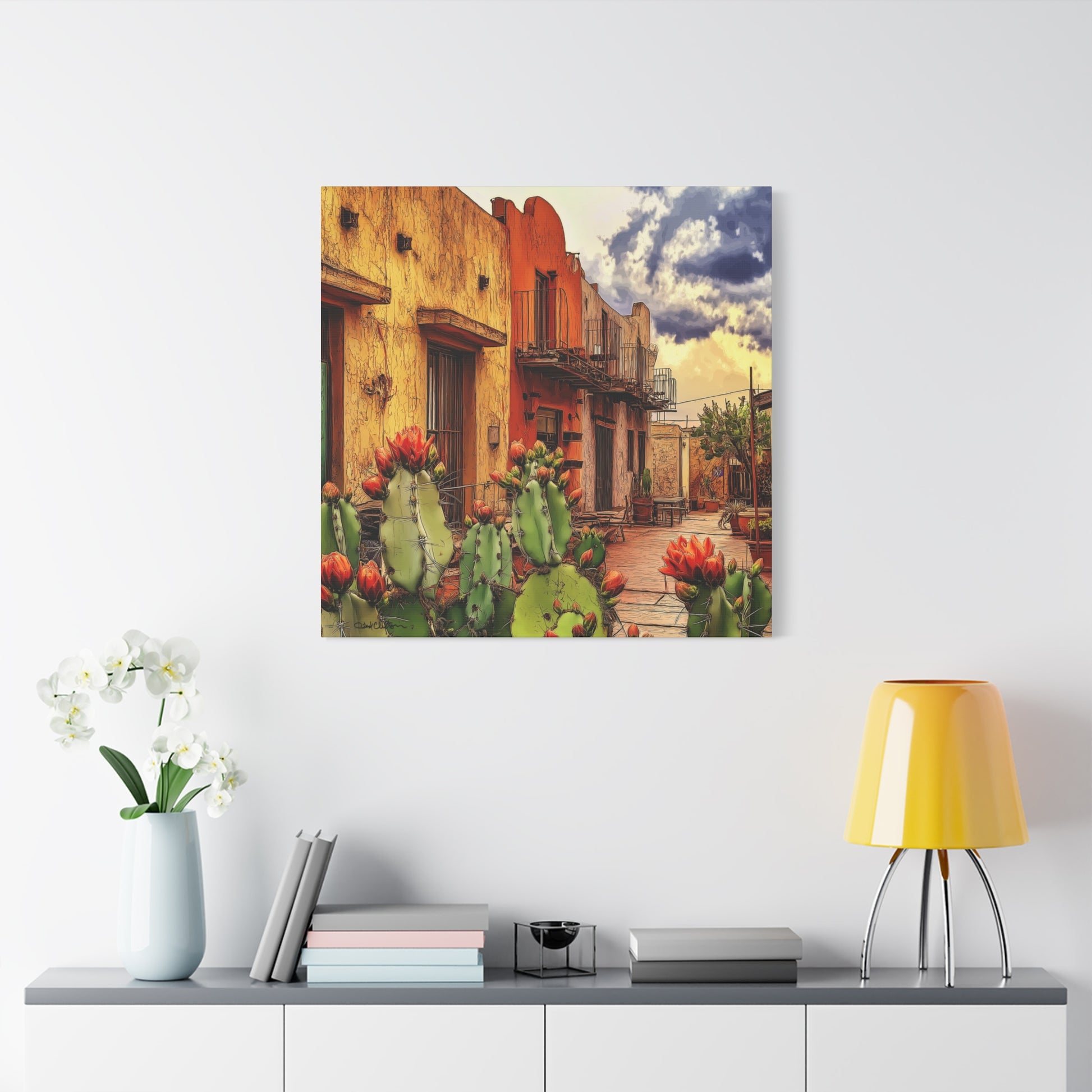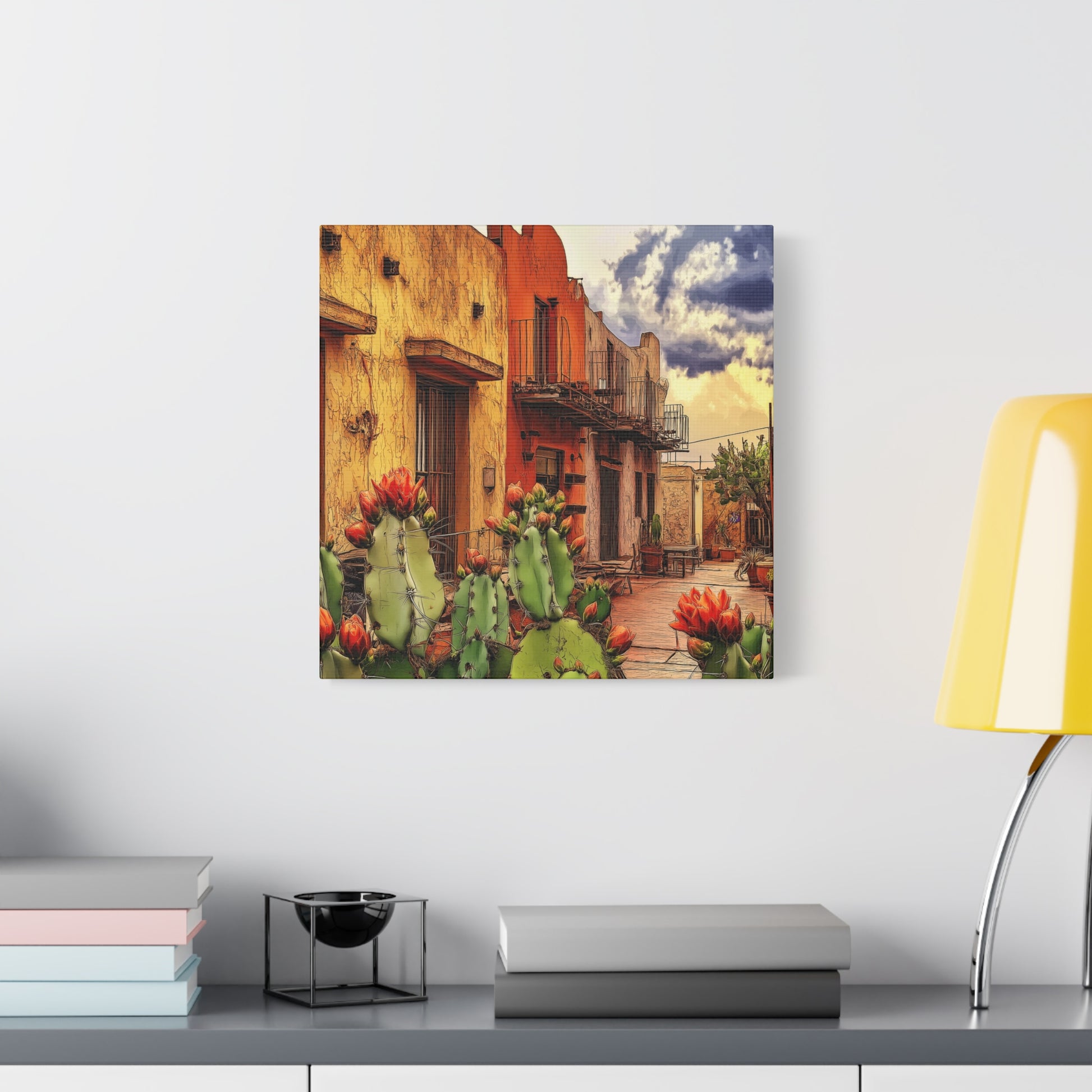 SW Village – Vibrant Southwest colors and imagery bring this scene to life. An adobe building framed by blooming cacti evokes the warmth, charm, and intrigue of an older small-town village, rich with history and character.