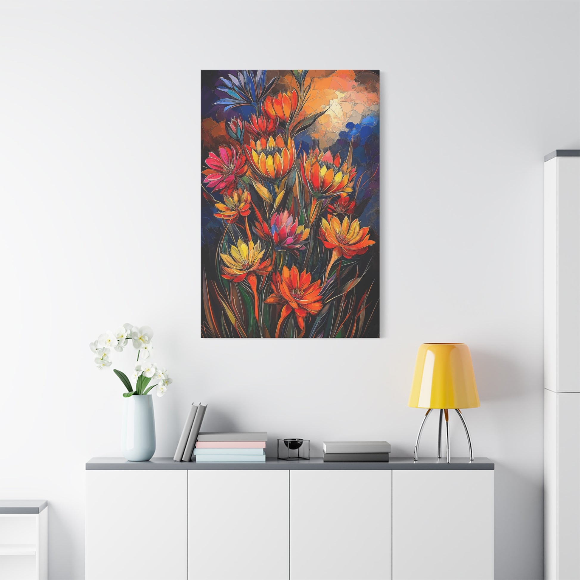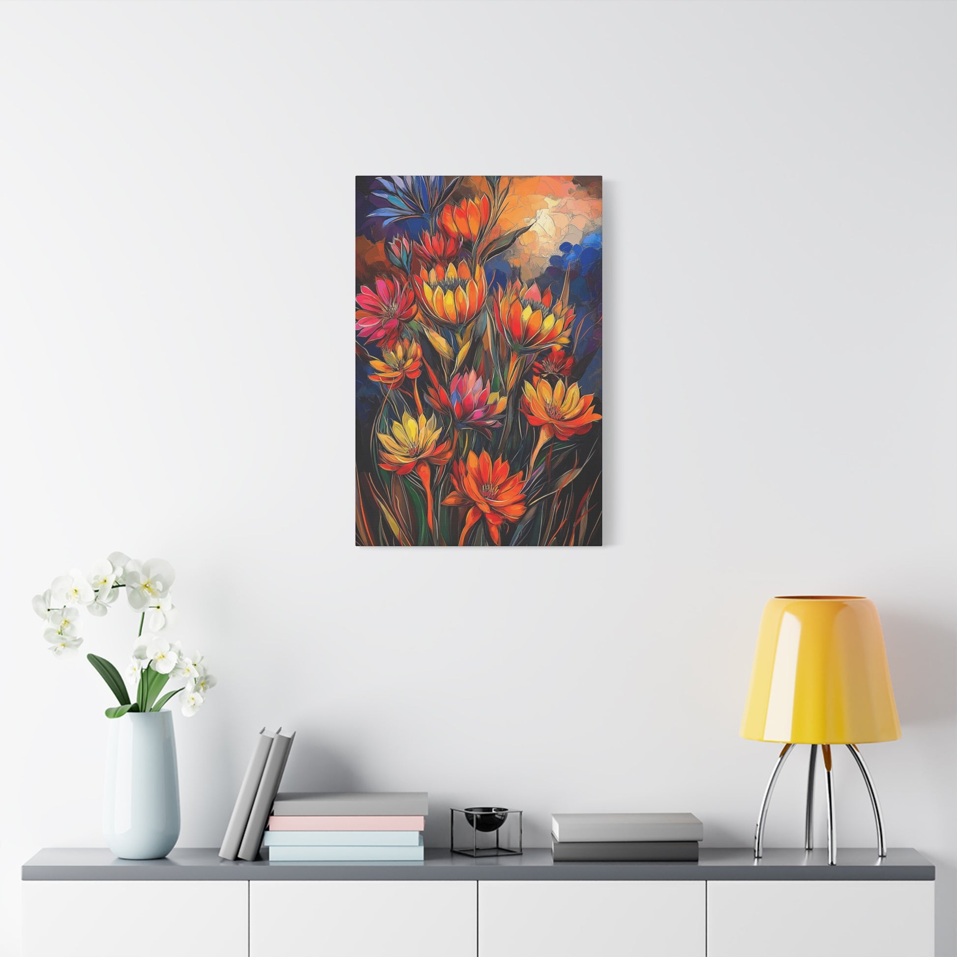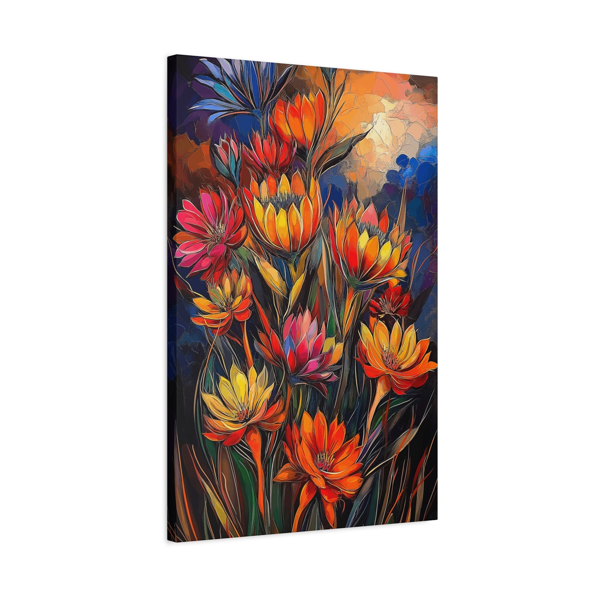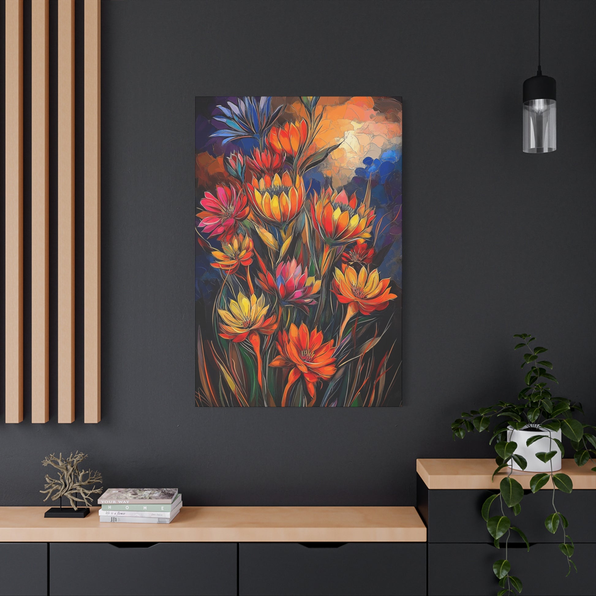 Bold Cacti Flowers – Wonderfully oversized blooms in vibrant, eye-catching colors that radiate energy and warmth. This striking piece will fill any room with visual joy and the lively spirit of the Southwest.